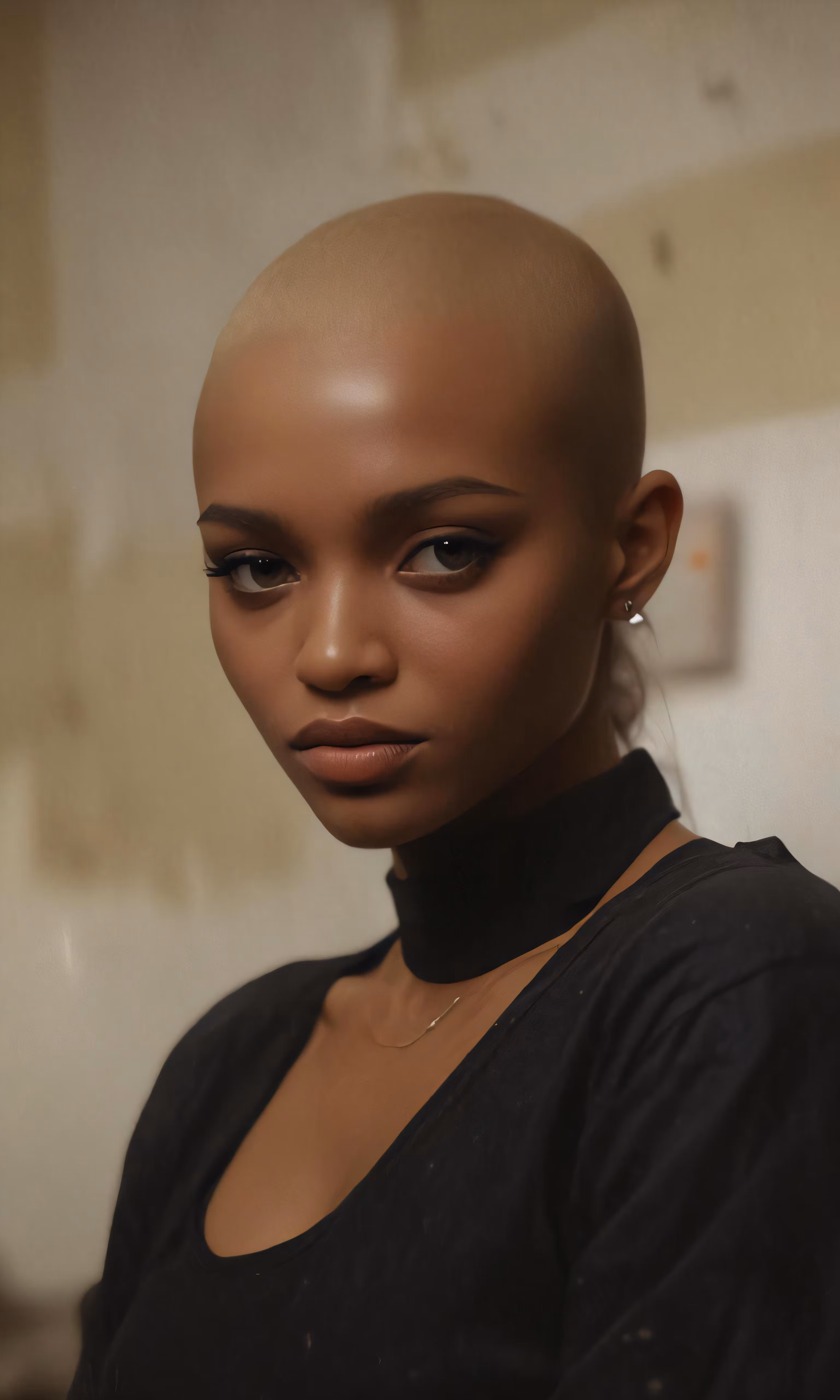High resolution picture, free to use, a woman with a bald head wearing a dress shirt
