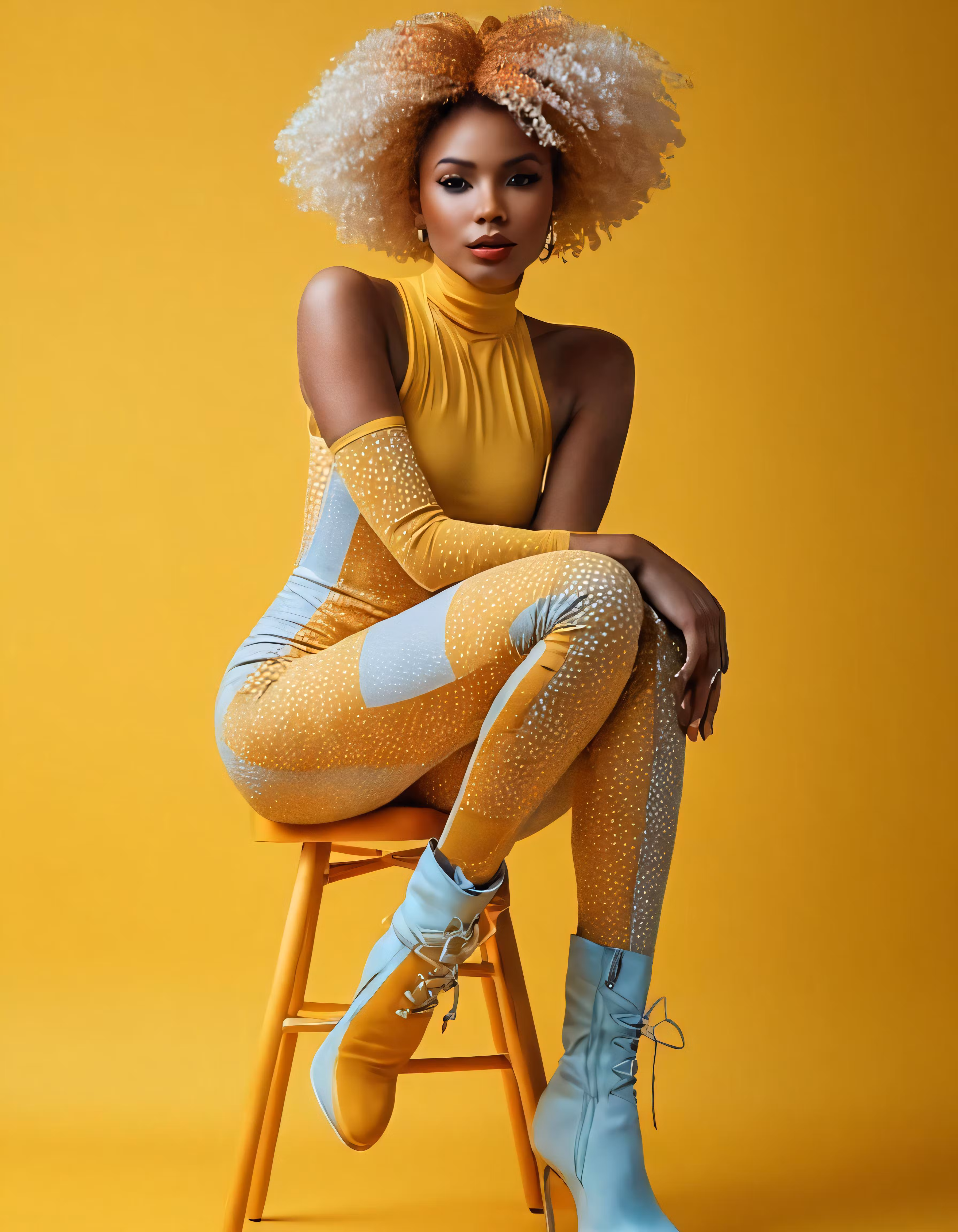 High resolution picture, free to use, a woman with a blonde afro sitting on a stool