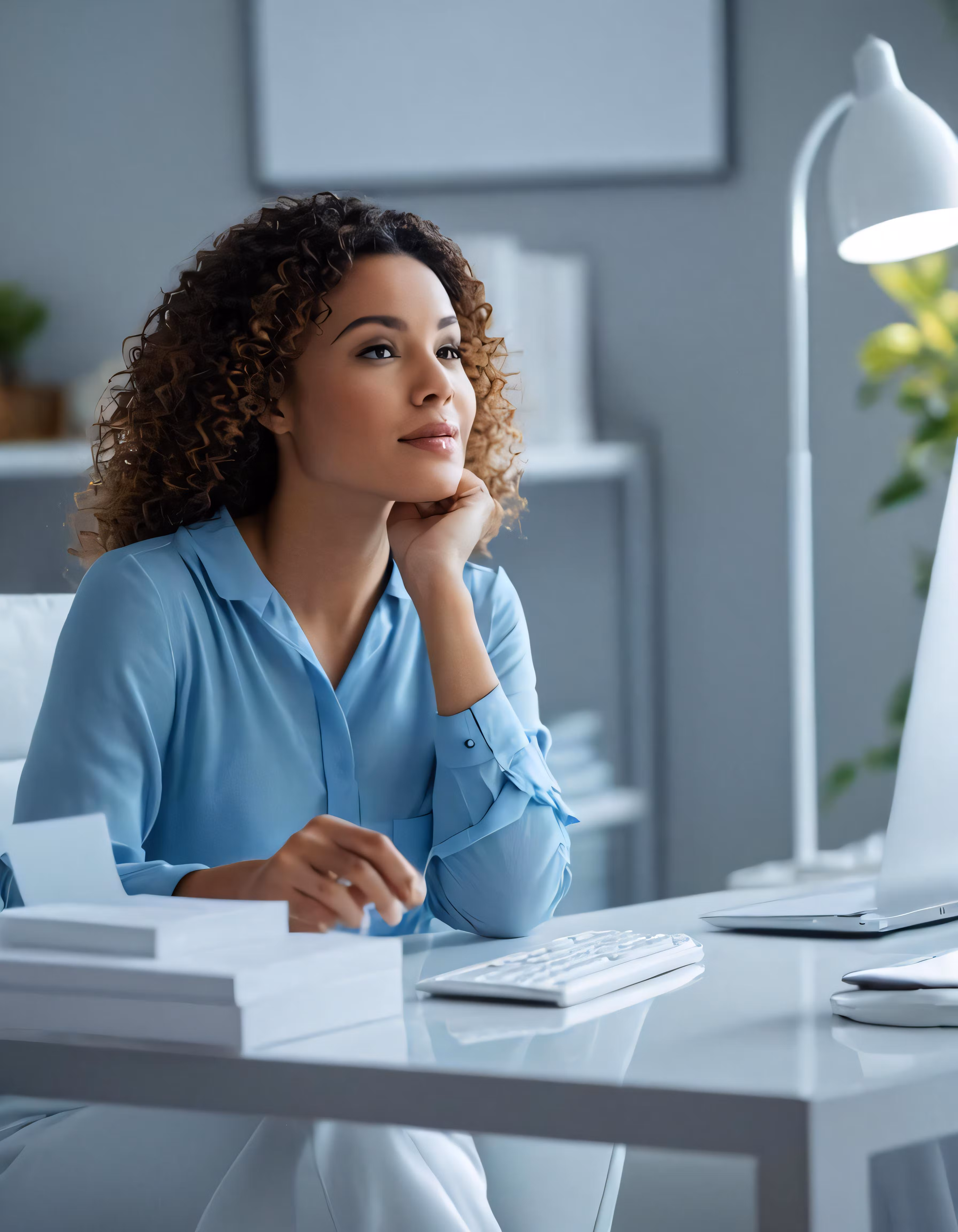 High resolution picture, free to use, a woman with a blue shirt sitting at a desk