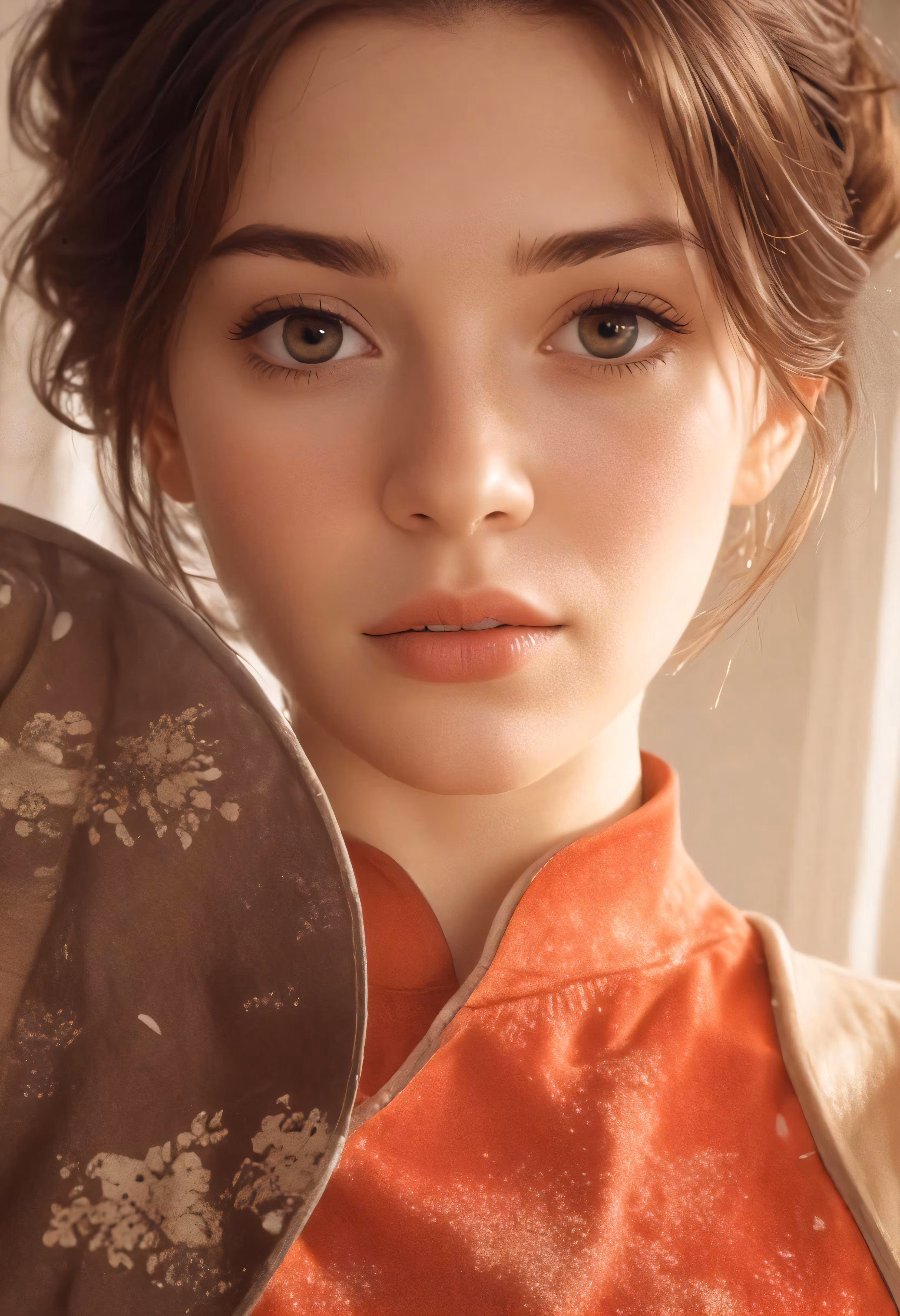 High resolution picture, free to use, a woman with a brown and orange dress looking at the camera
