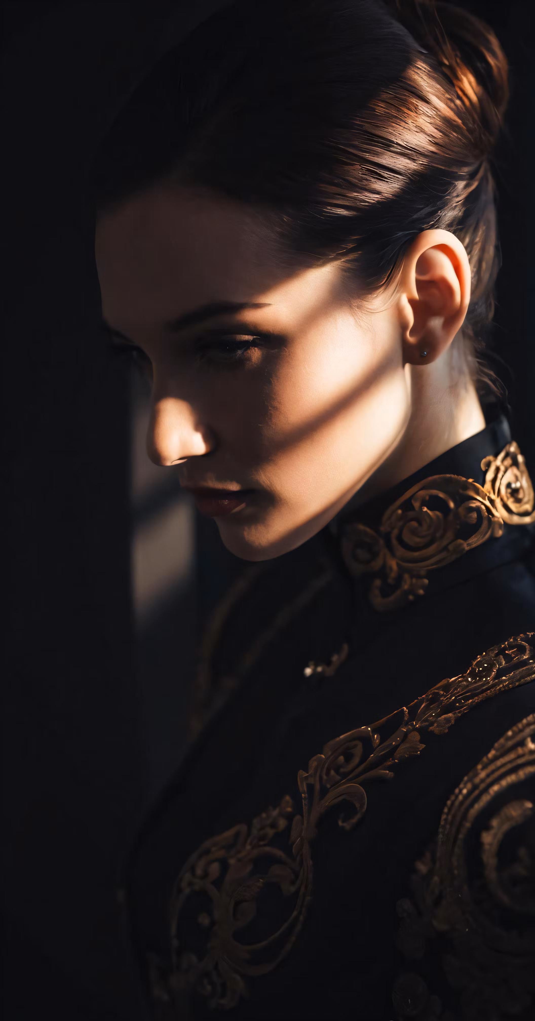 High resolution picture, free to use, a woman with a bun in her hair looking down