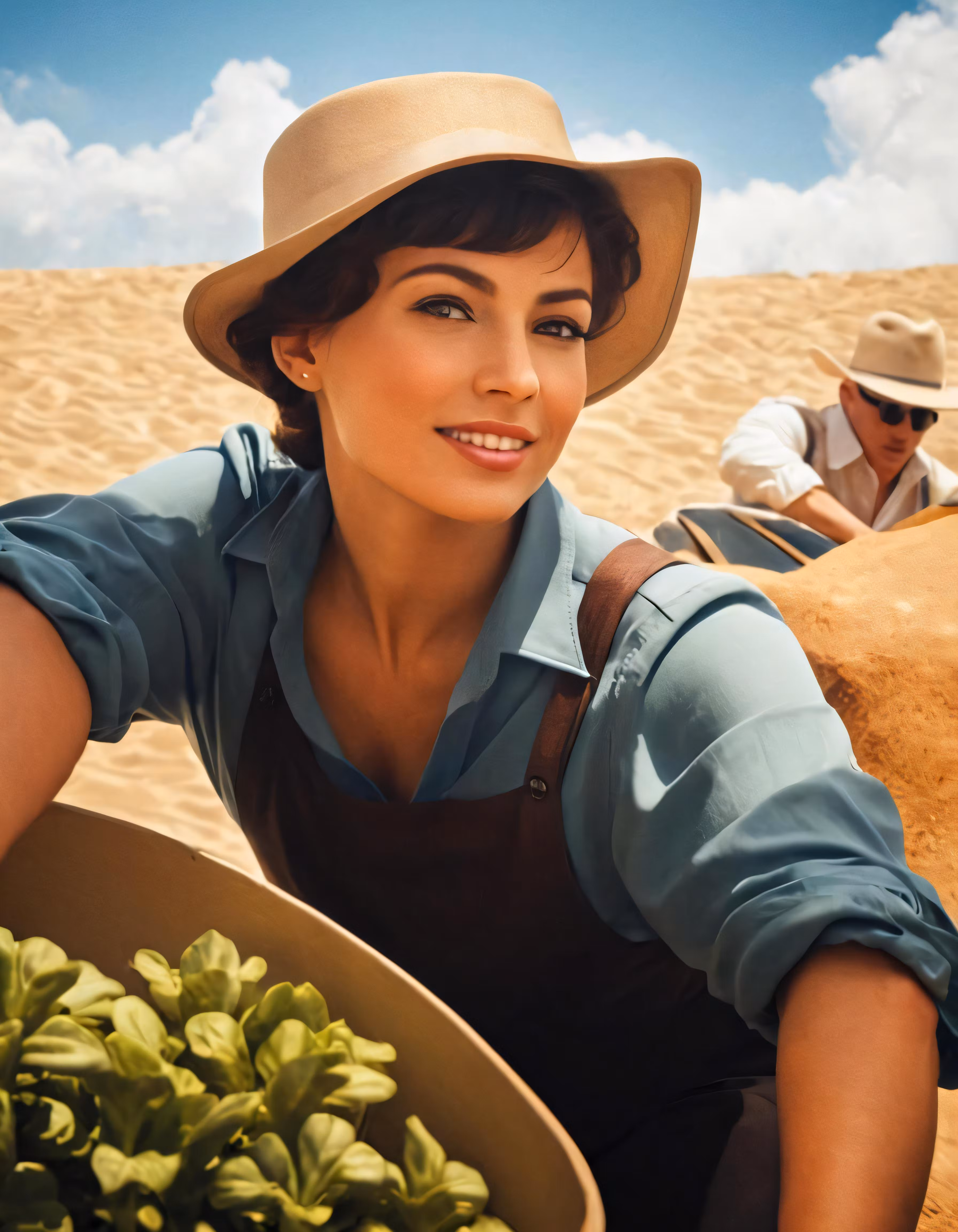 High resolution picture, free to use, a woman with a cowboy hat leaning over a bowl of greens