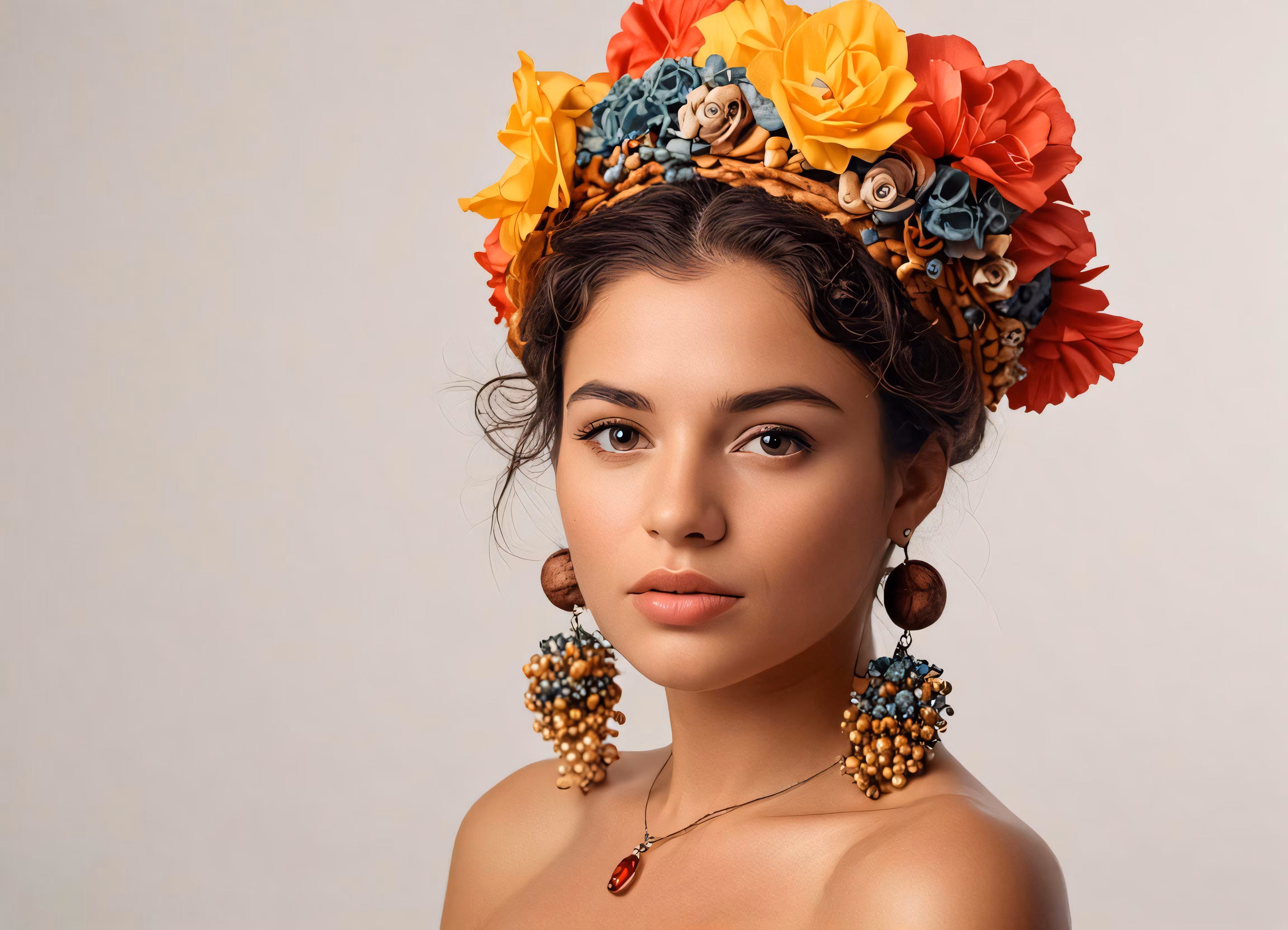 High resolution picture, free to use, a woman with a floral headpiece with large circular earrings