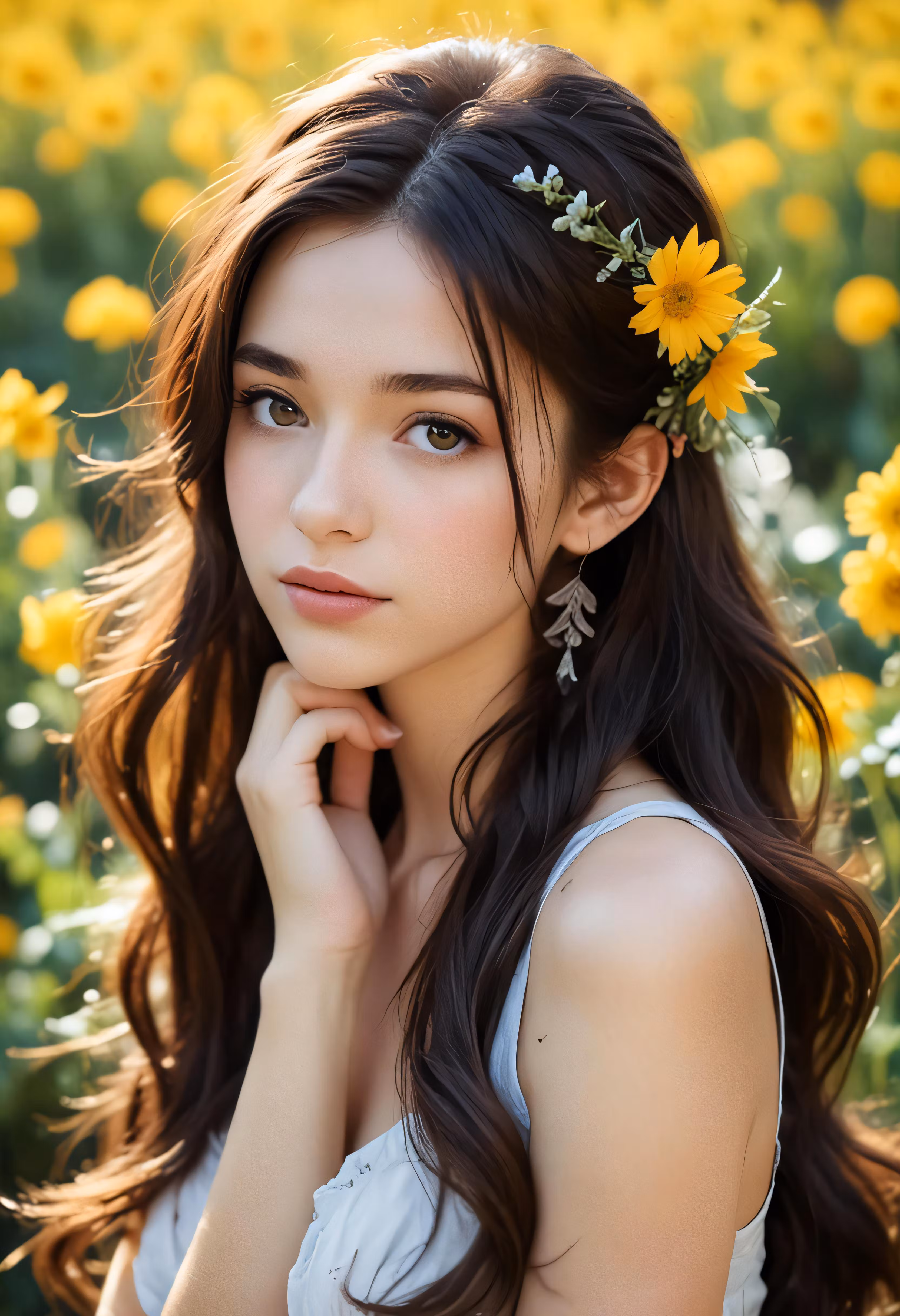 High resolution picture, free to use, a woman with a flower in her hair standing among flowers