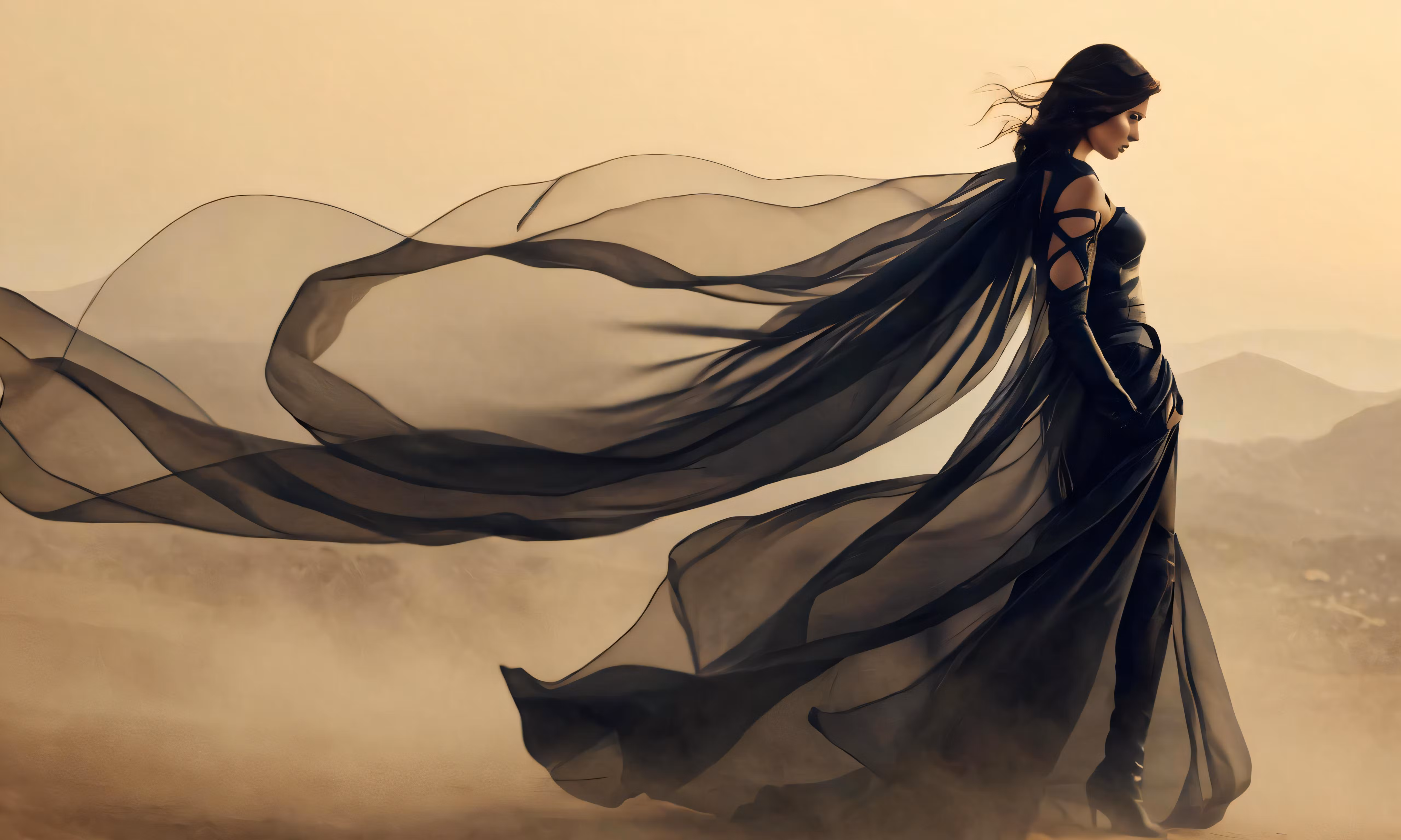 High resolution picture, free to use, a woman with a flying dress and mountains in the background