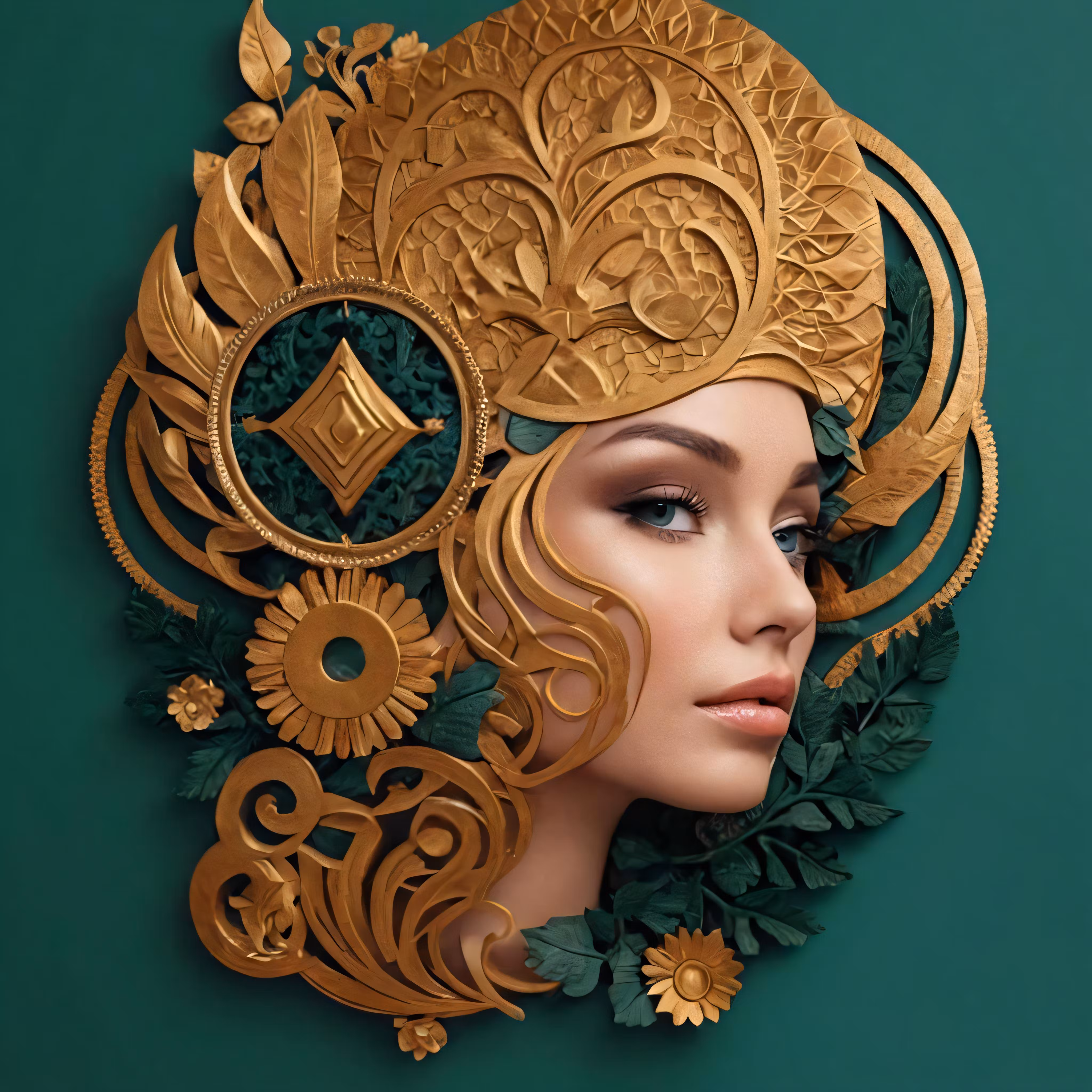 High resolution picture, free to use, a woman with a golden mask on is against a green background