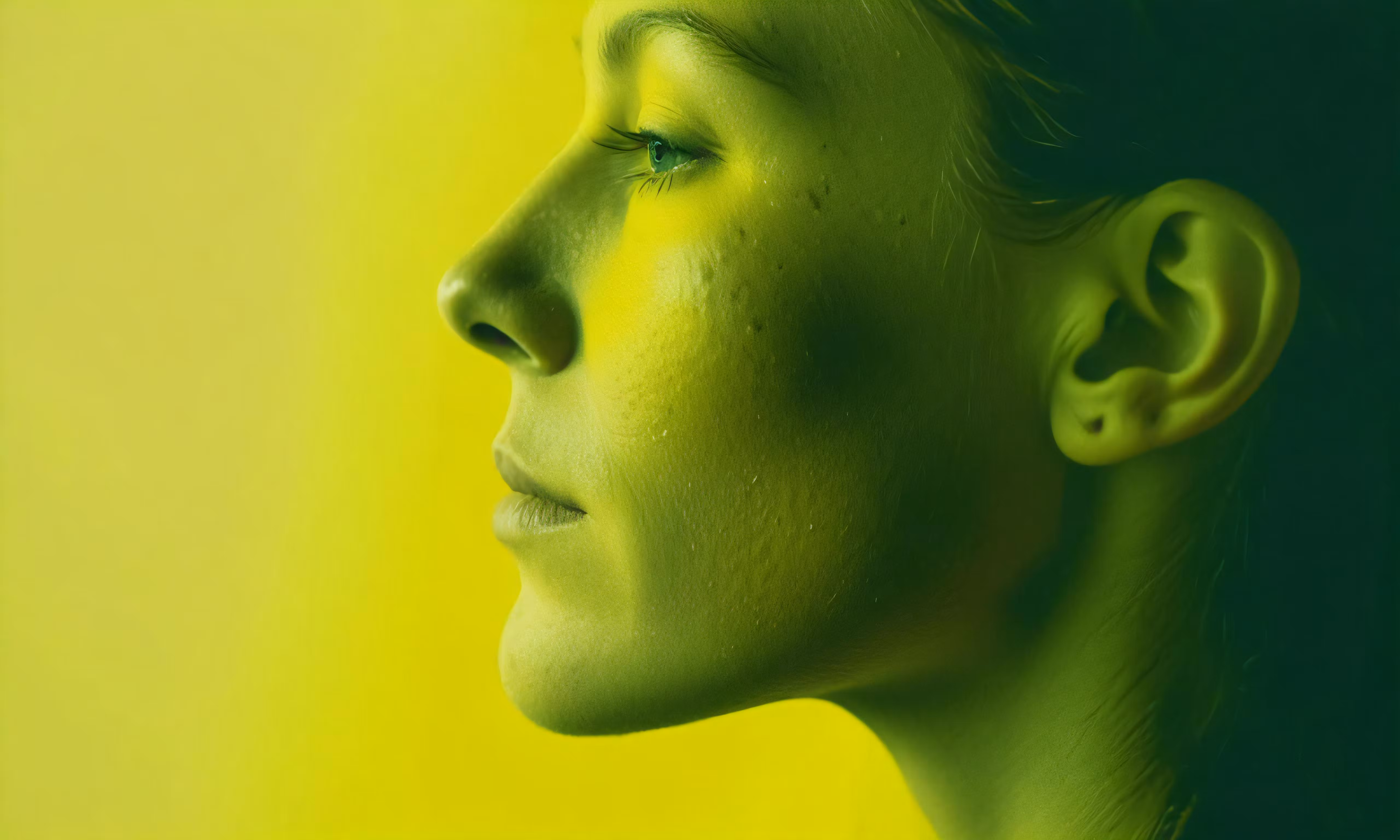 High resolution picture, free to use, a woman with a green make up of her face and ear