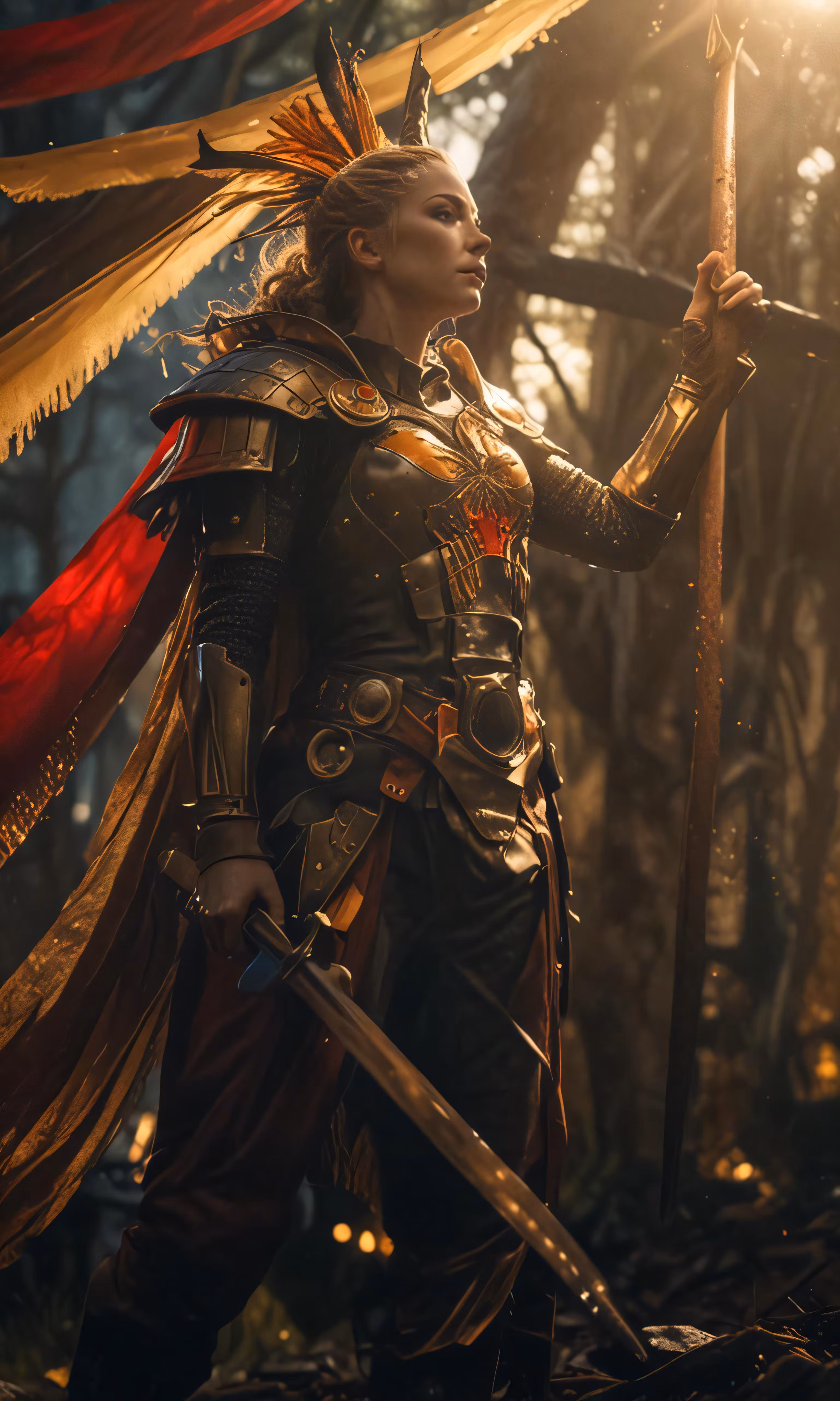 High resolution picture, free to use, a woman with a large sword and armor in a forest