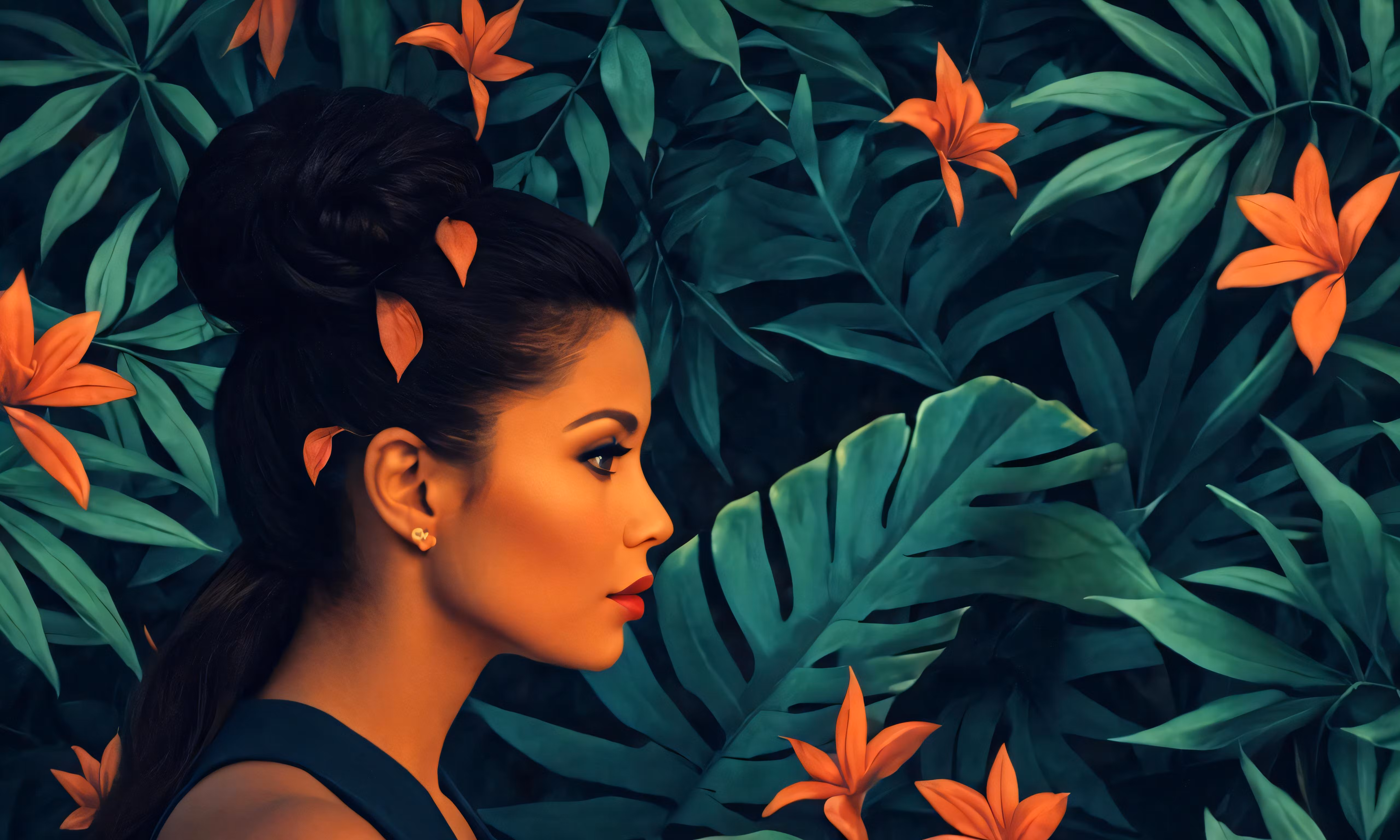 High resolution picture, free to use, a woman with a ponytail and black top surrounded by green leaves