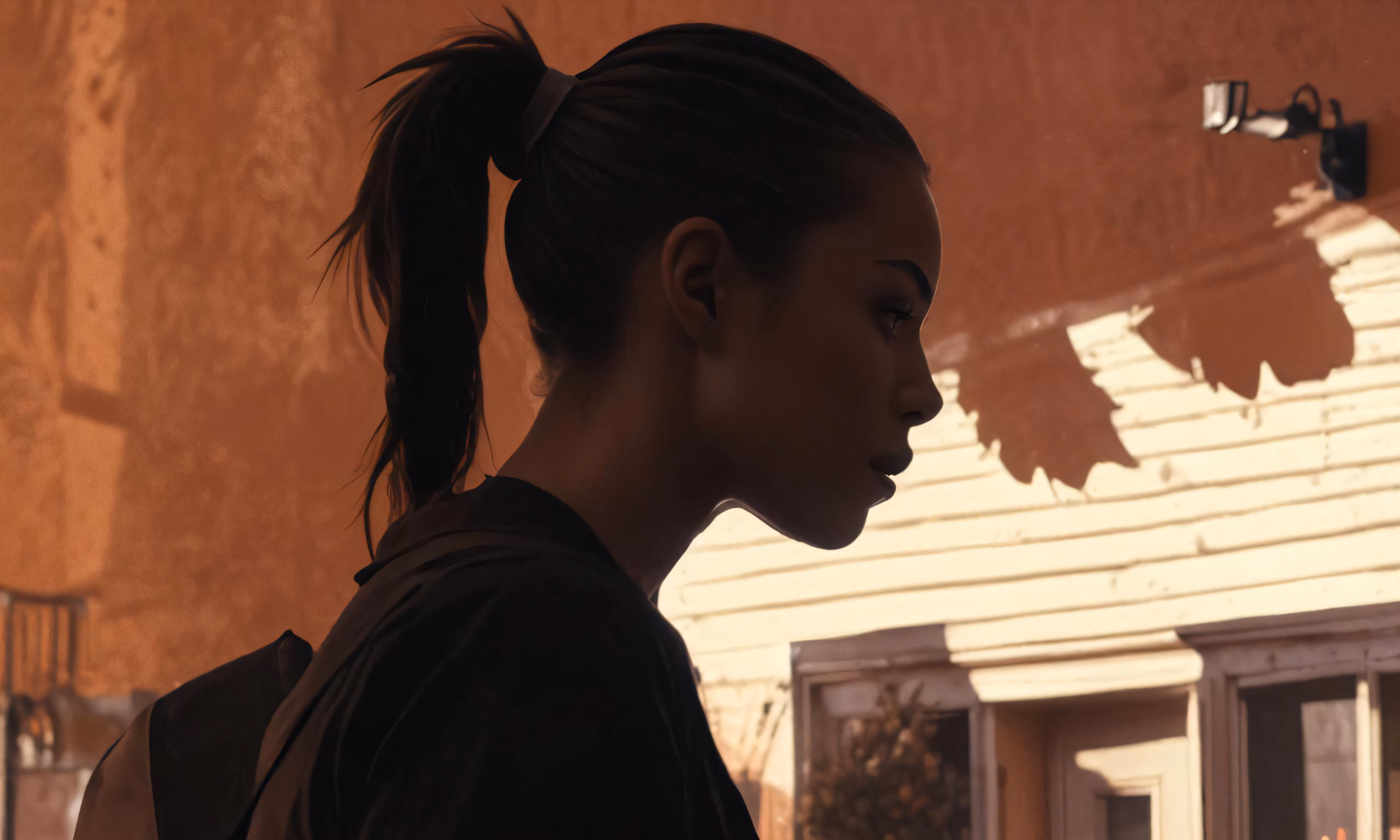 High resolution picture, free to use, a woman with a ponytail standing in front of a building