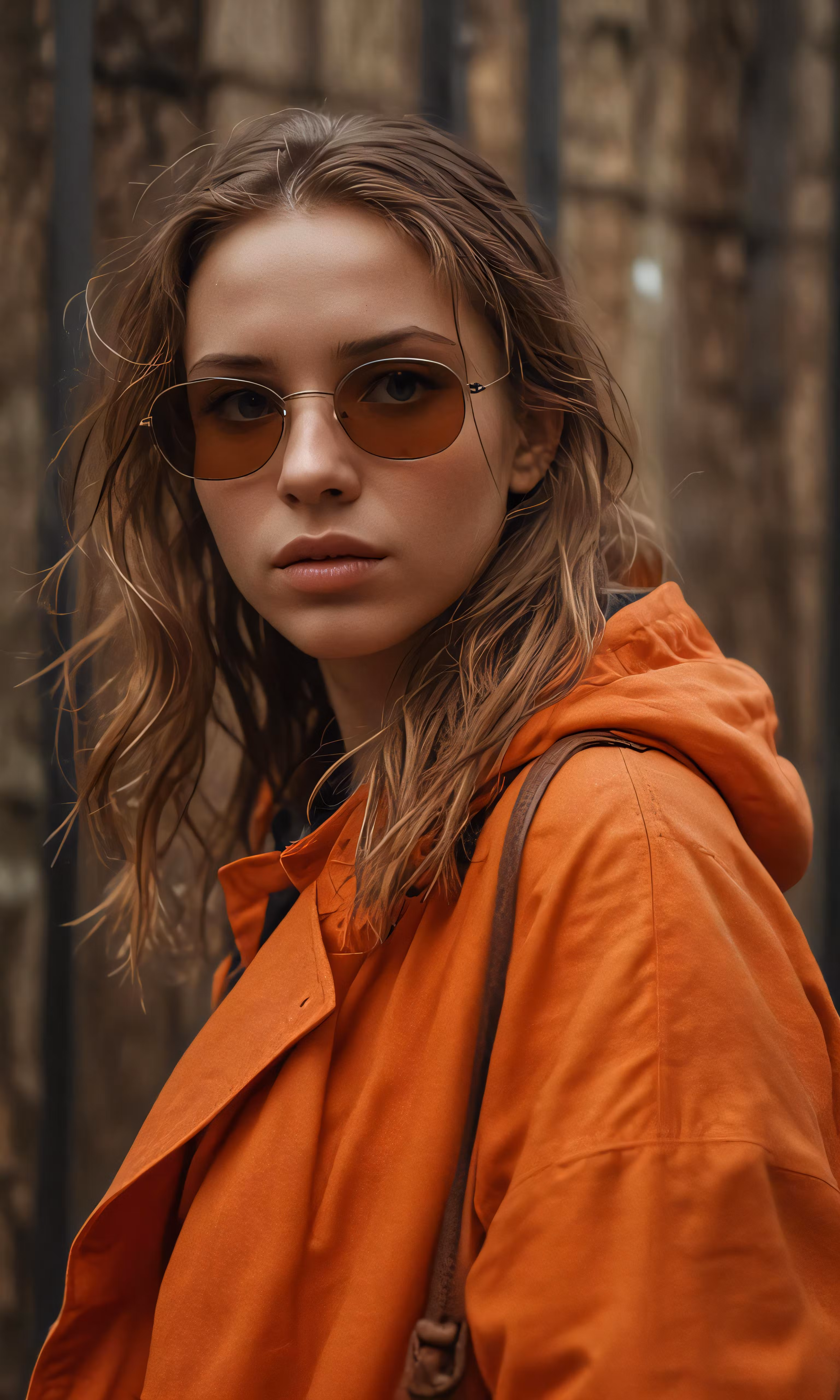 High resolution picture, free to use, a woman with a red coat and sunglasses on