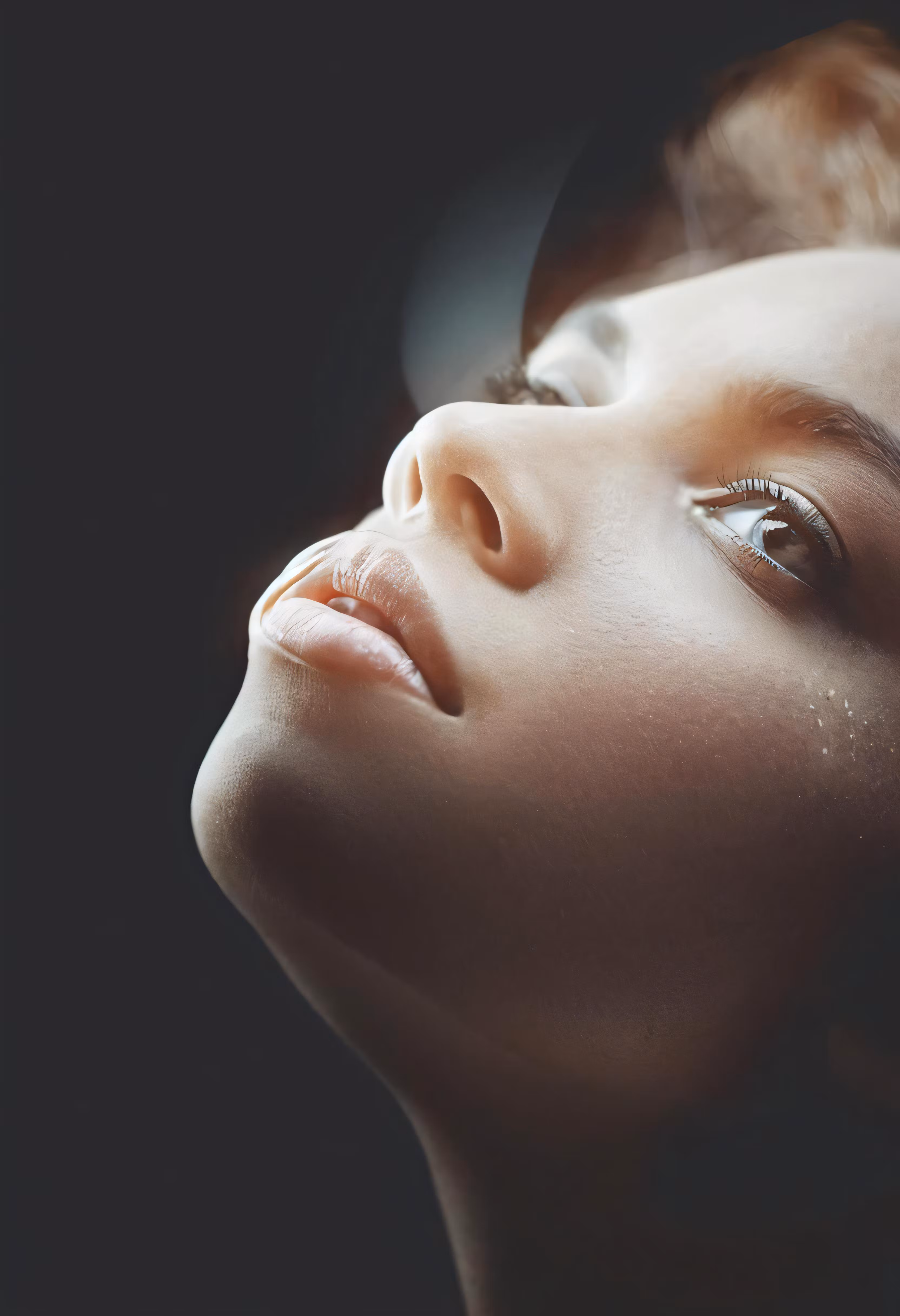 High resolution picture, free to use, a woman with a smoky face is looking up into the air