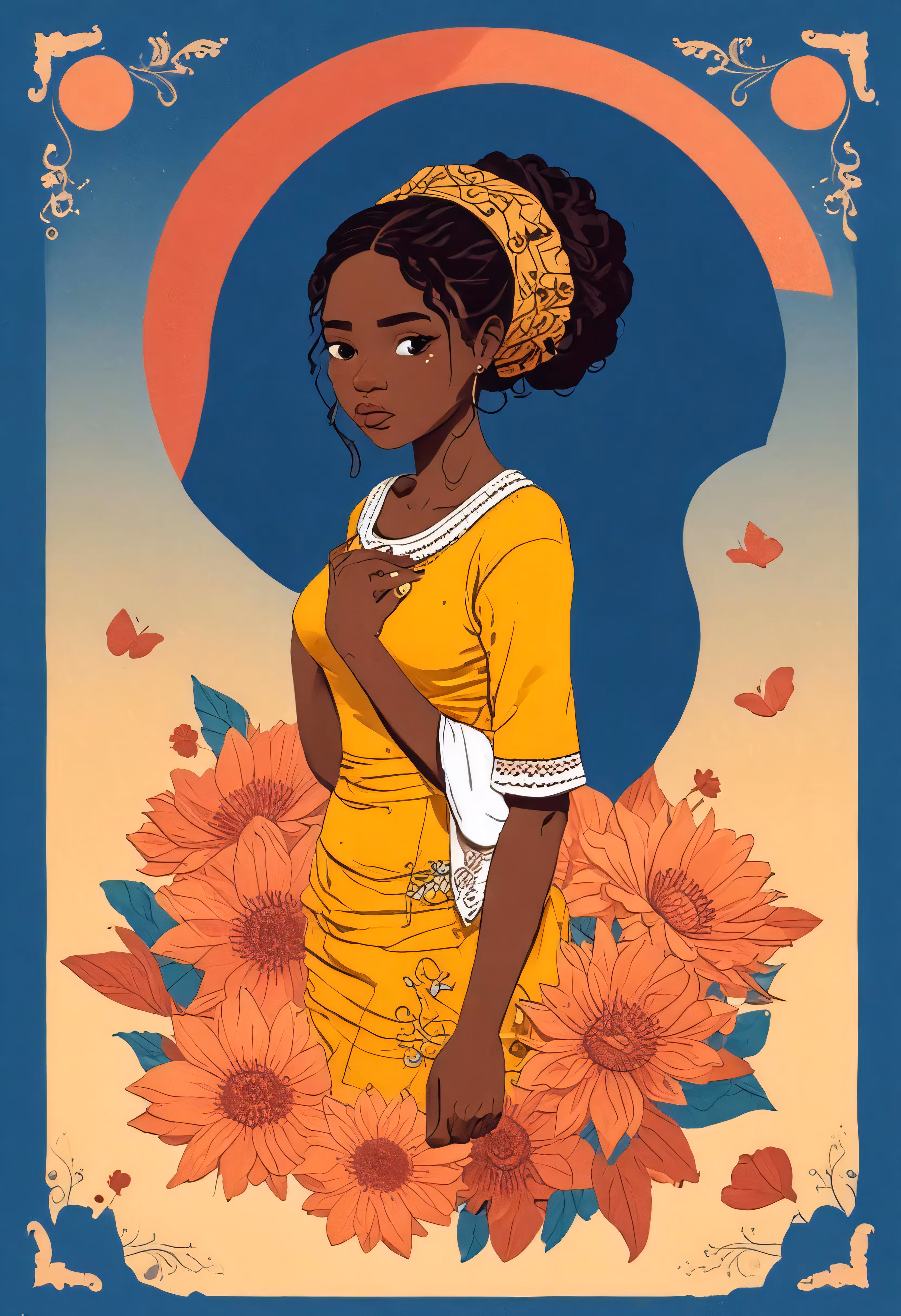 High resolution picture, free to use, a woman with a yellow dress and a red and blue background, holding flowers