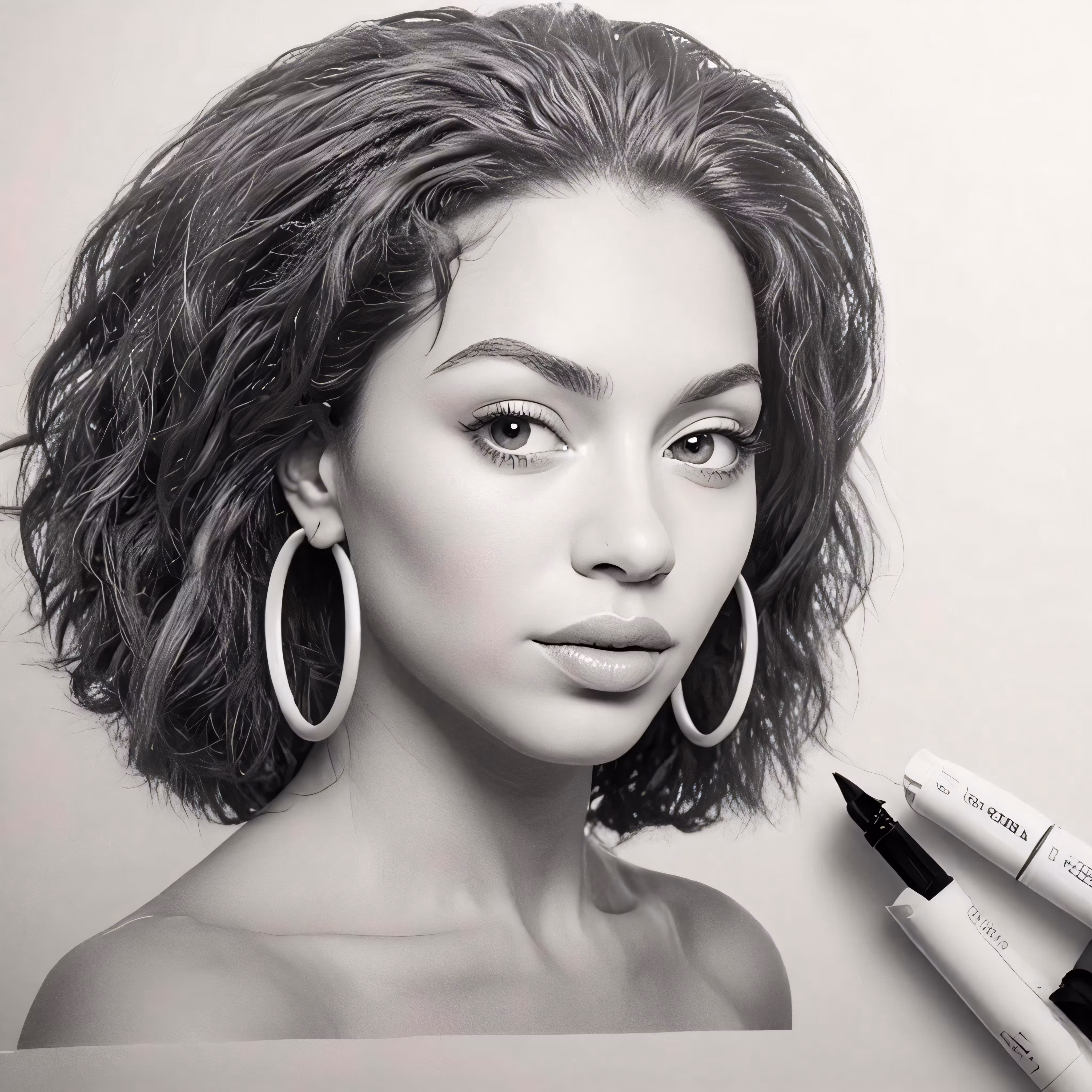 High resolution picture, free to use, a woman with big hoop earrings on is shown, next to a pen