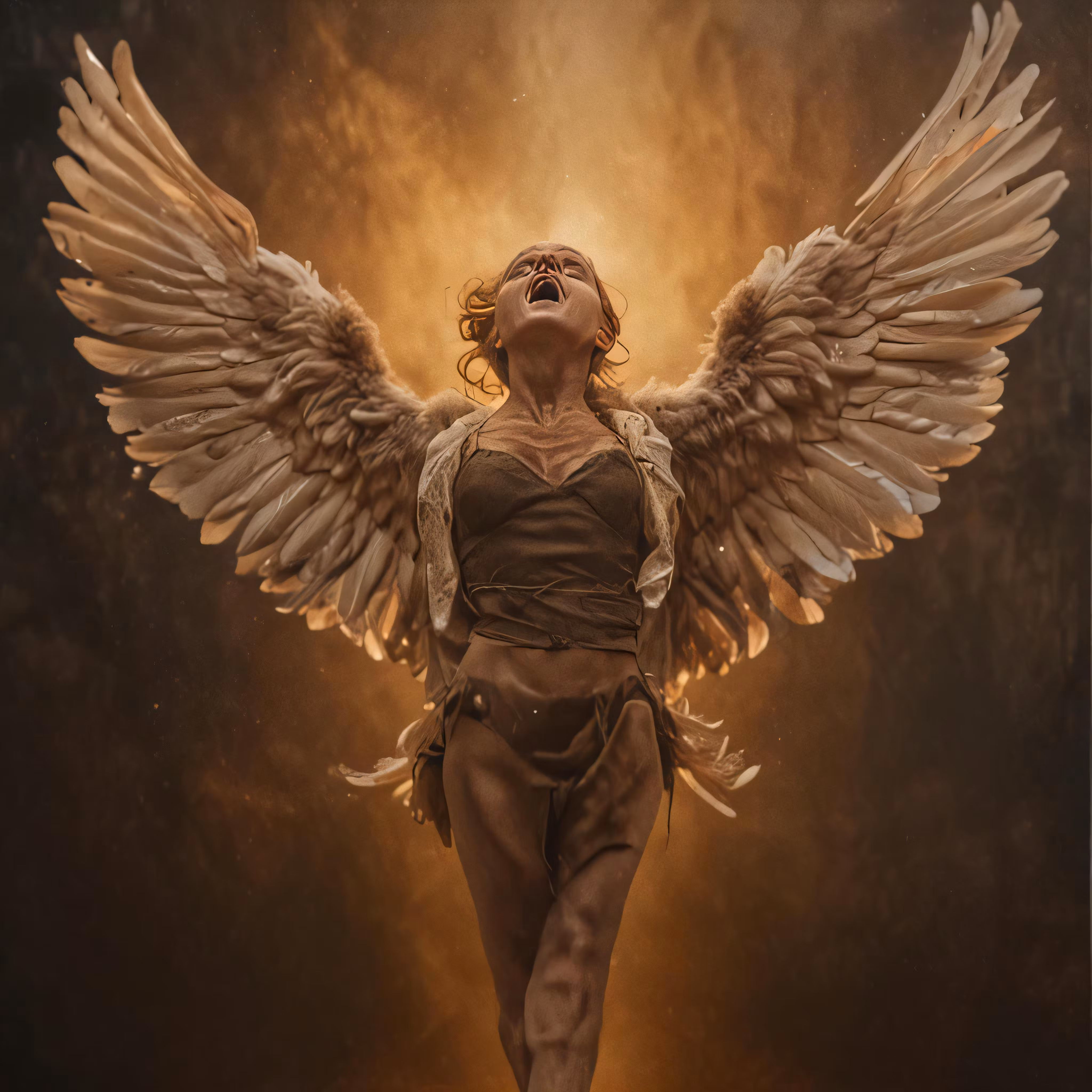 High resolution picture, free to use, a woman with big white wings standing in front of a light