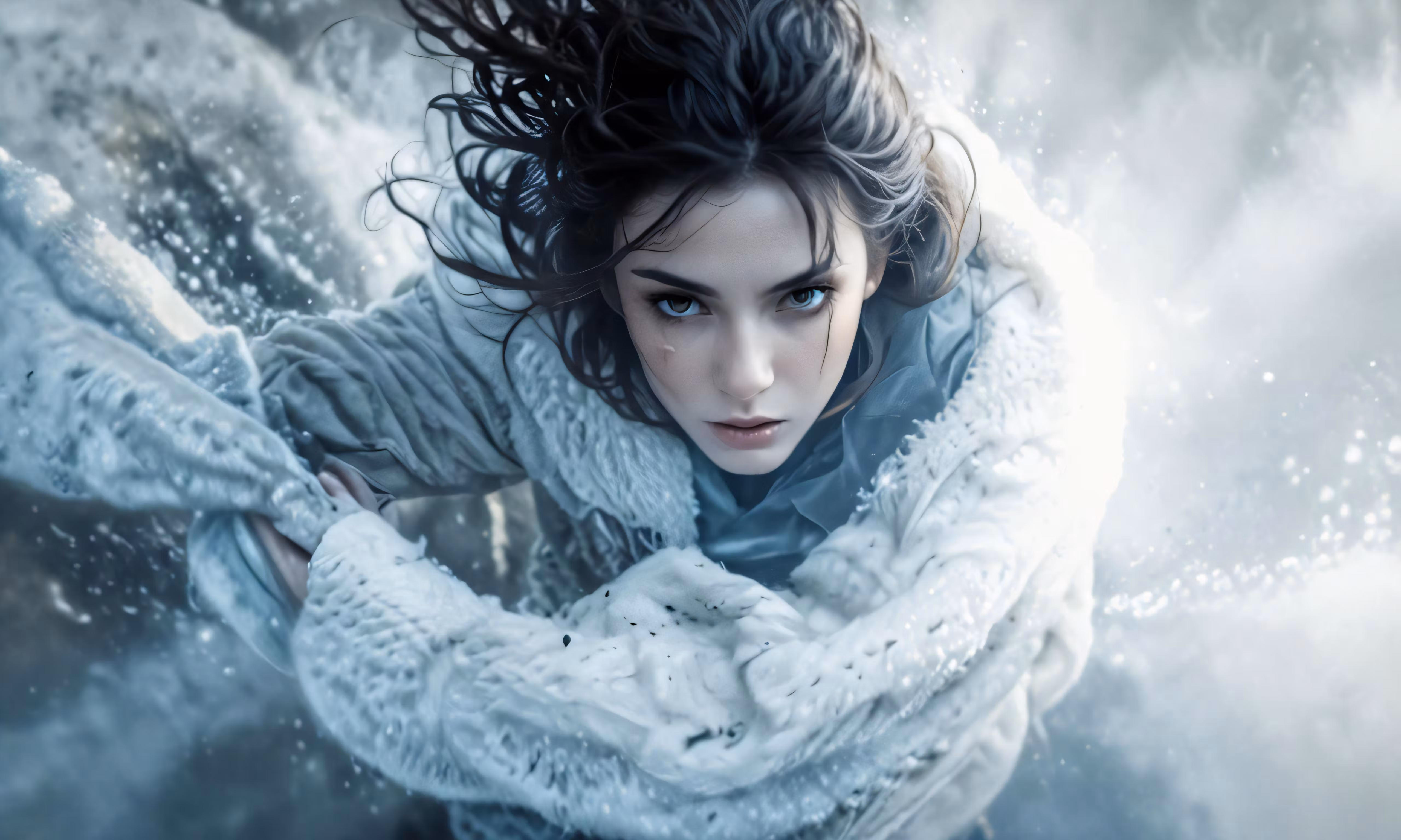High resolution picture, free to use, a woman with black hair and white sweater is in the air, holding onto two large wings