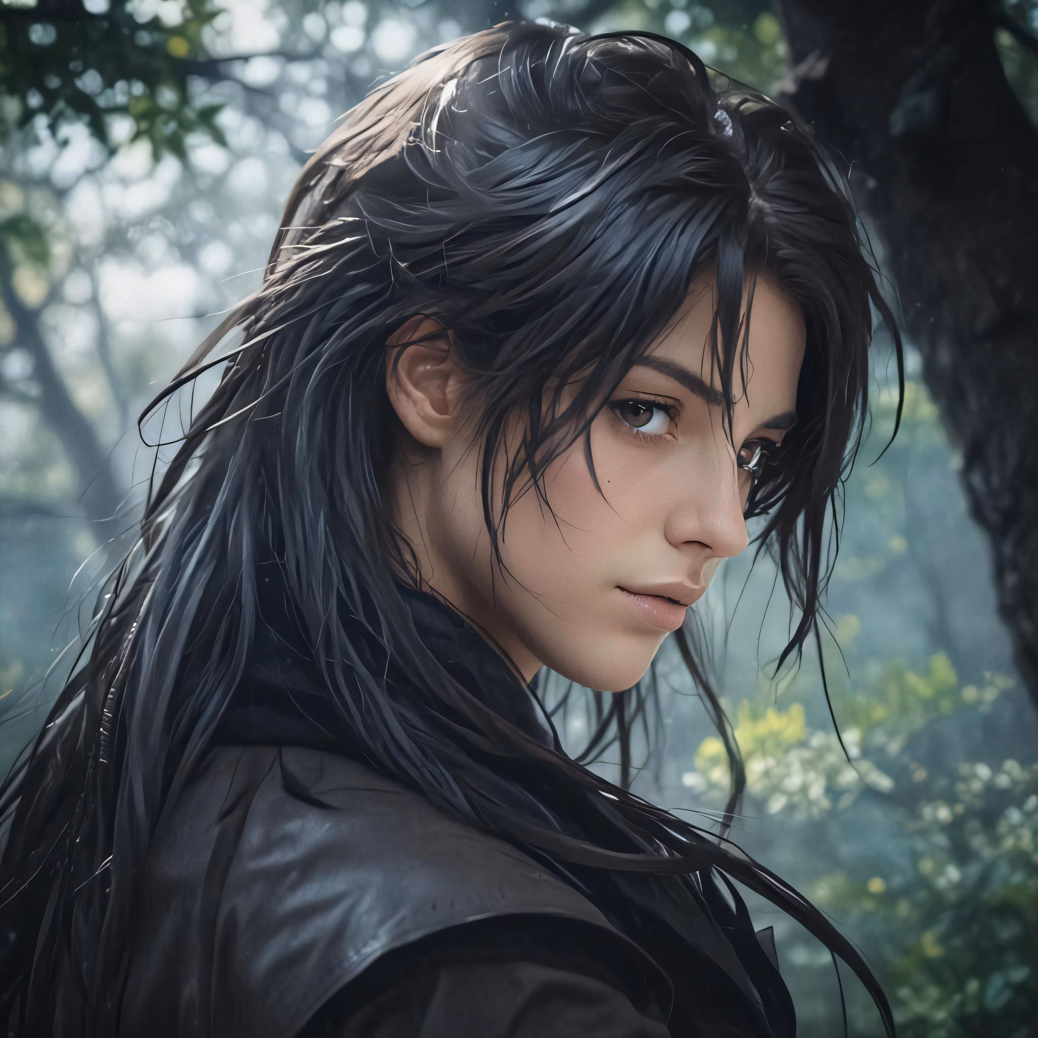 High resolution picture, free to use, a woman with black hair standing in front of a forest