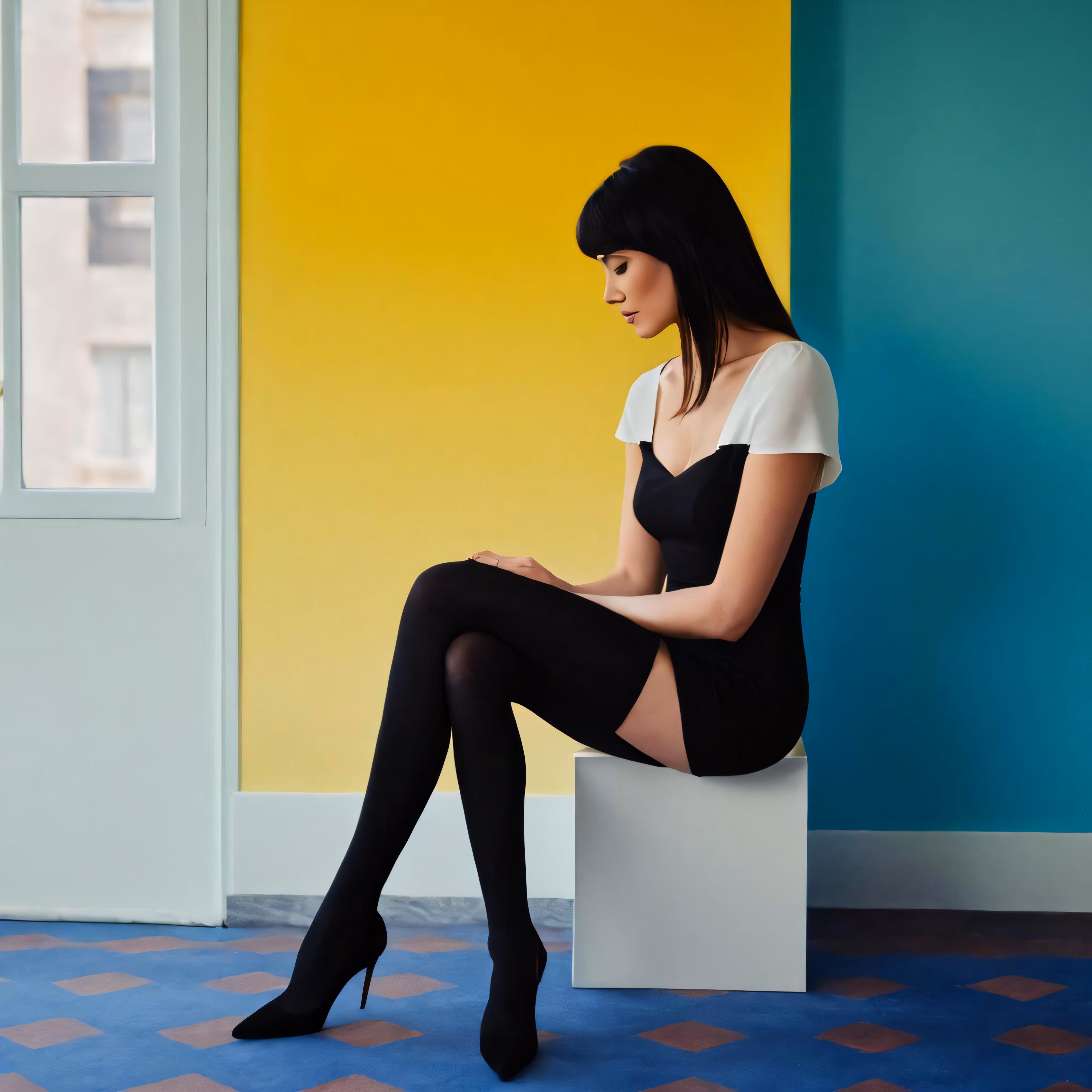 High resolution picture, free to use, a woman with black stockings and black dress sits on a box