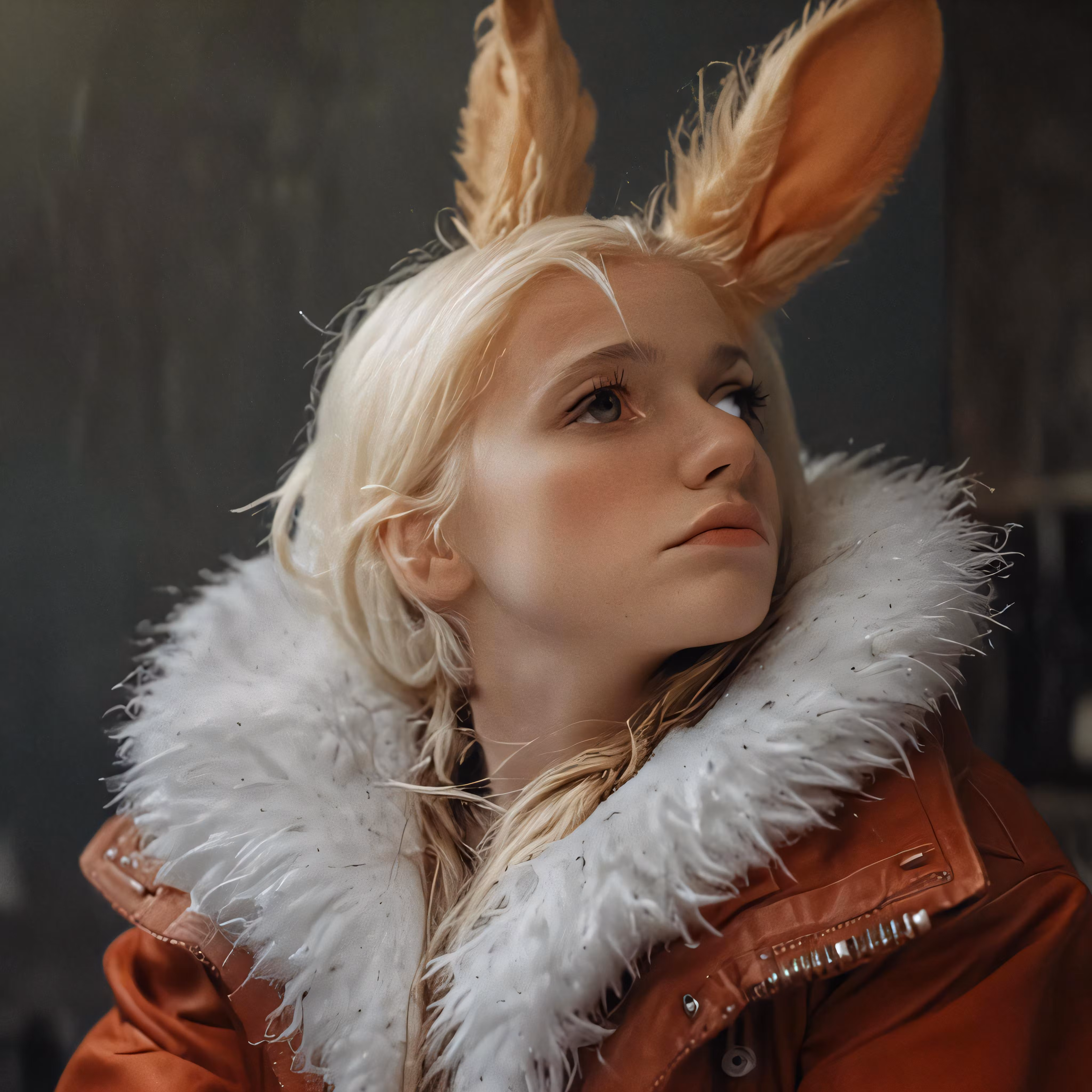 High resolution picture, free to use, a woman with blond hair and a red coat has a fox ears hat on