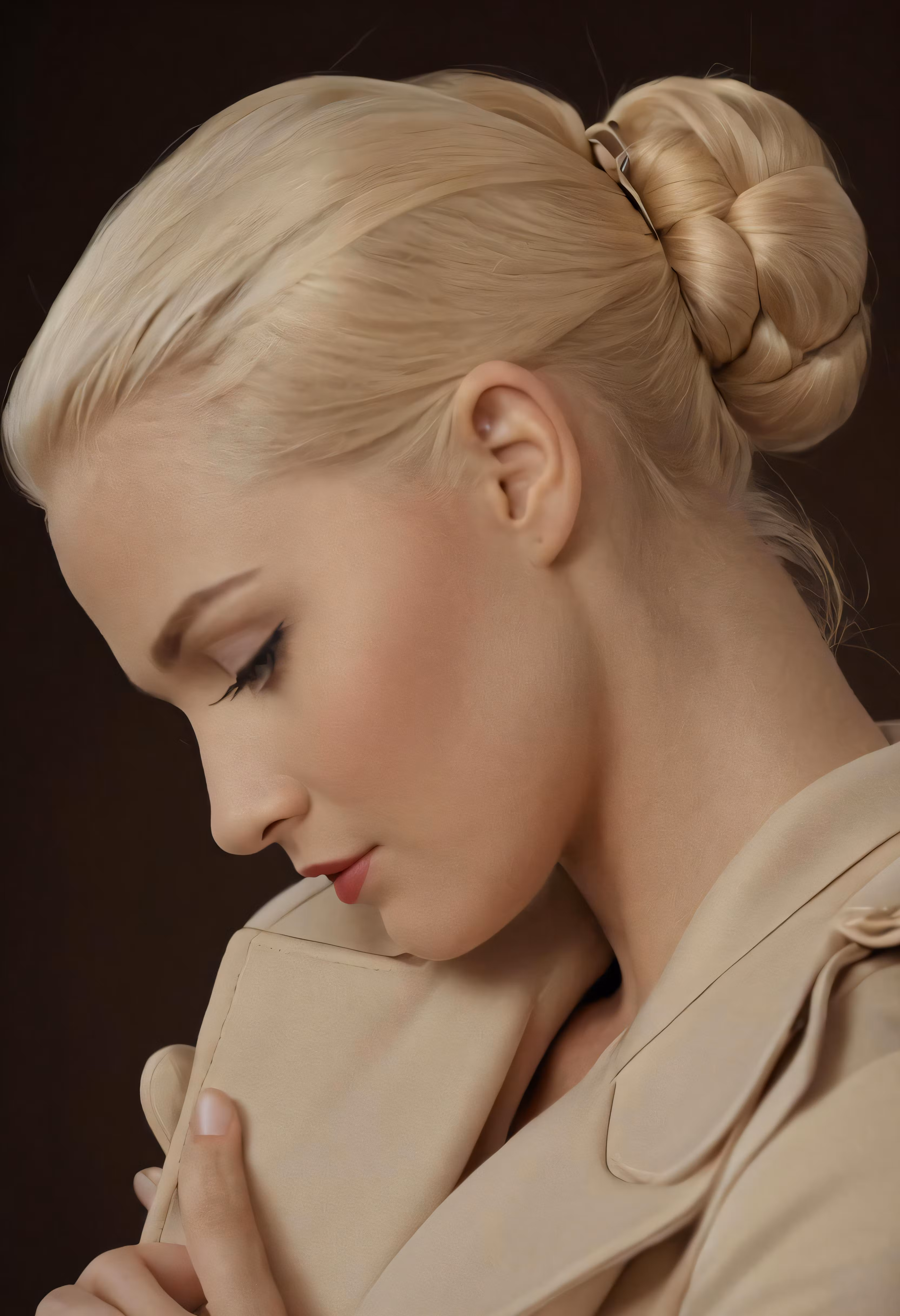 High resolution picture, free to use, a woman with blond hair and a top knot