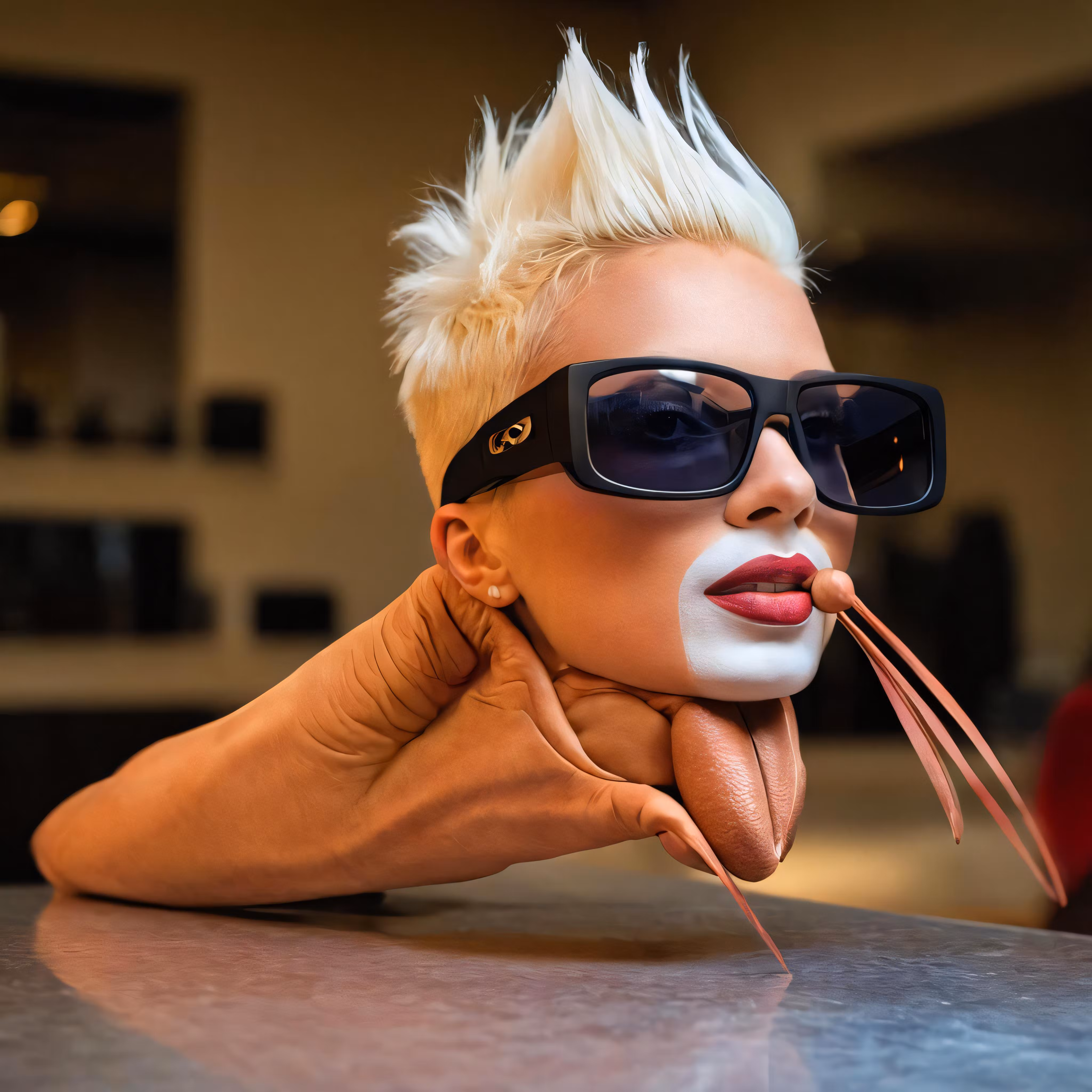 High resolution picture, free to use, a woman with blond hair and white makeup in sunglasses
