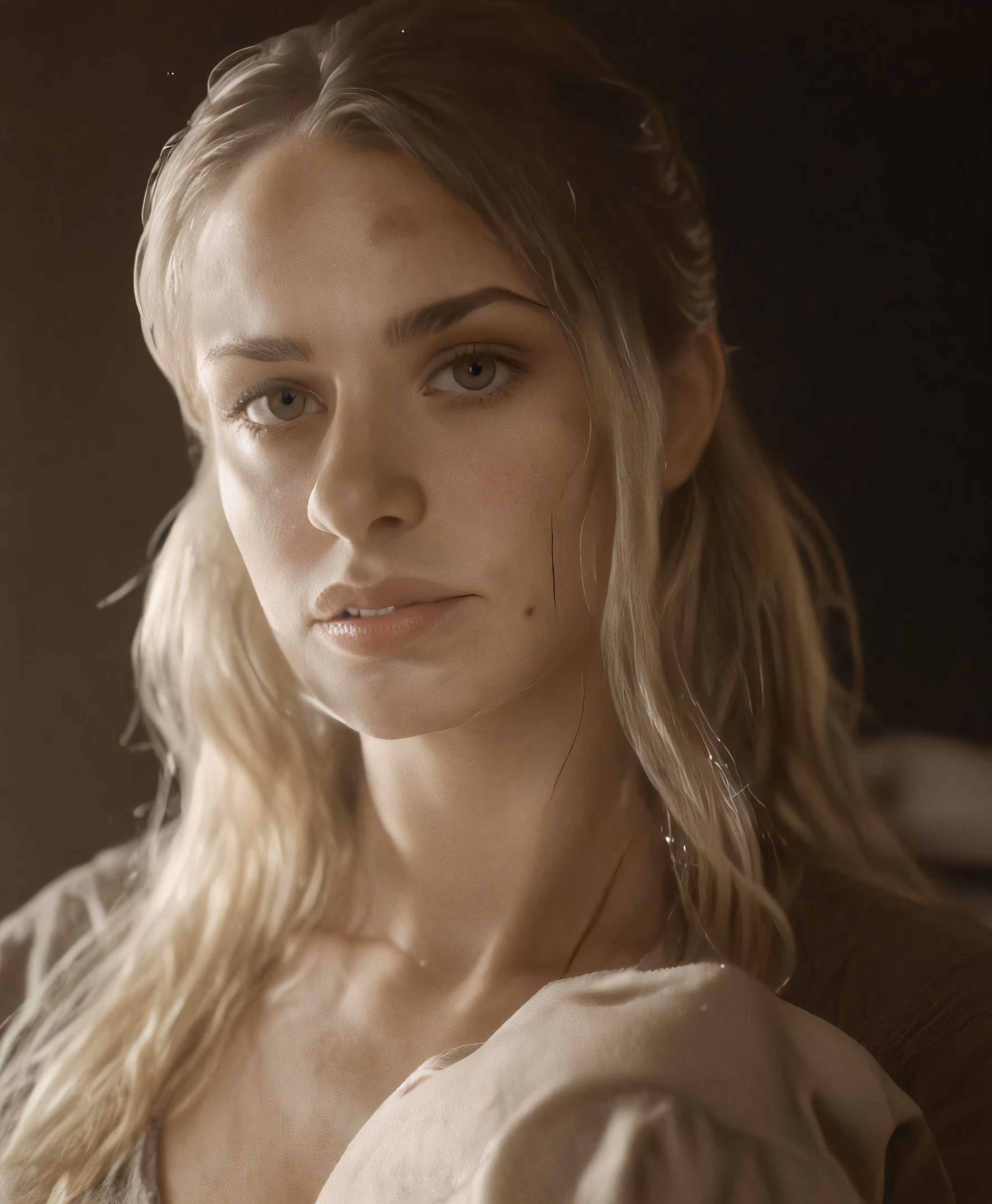 High resolution picture, free to use, a woman with blonde hair and a brown jacket
