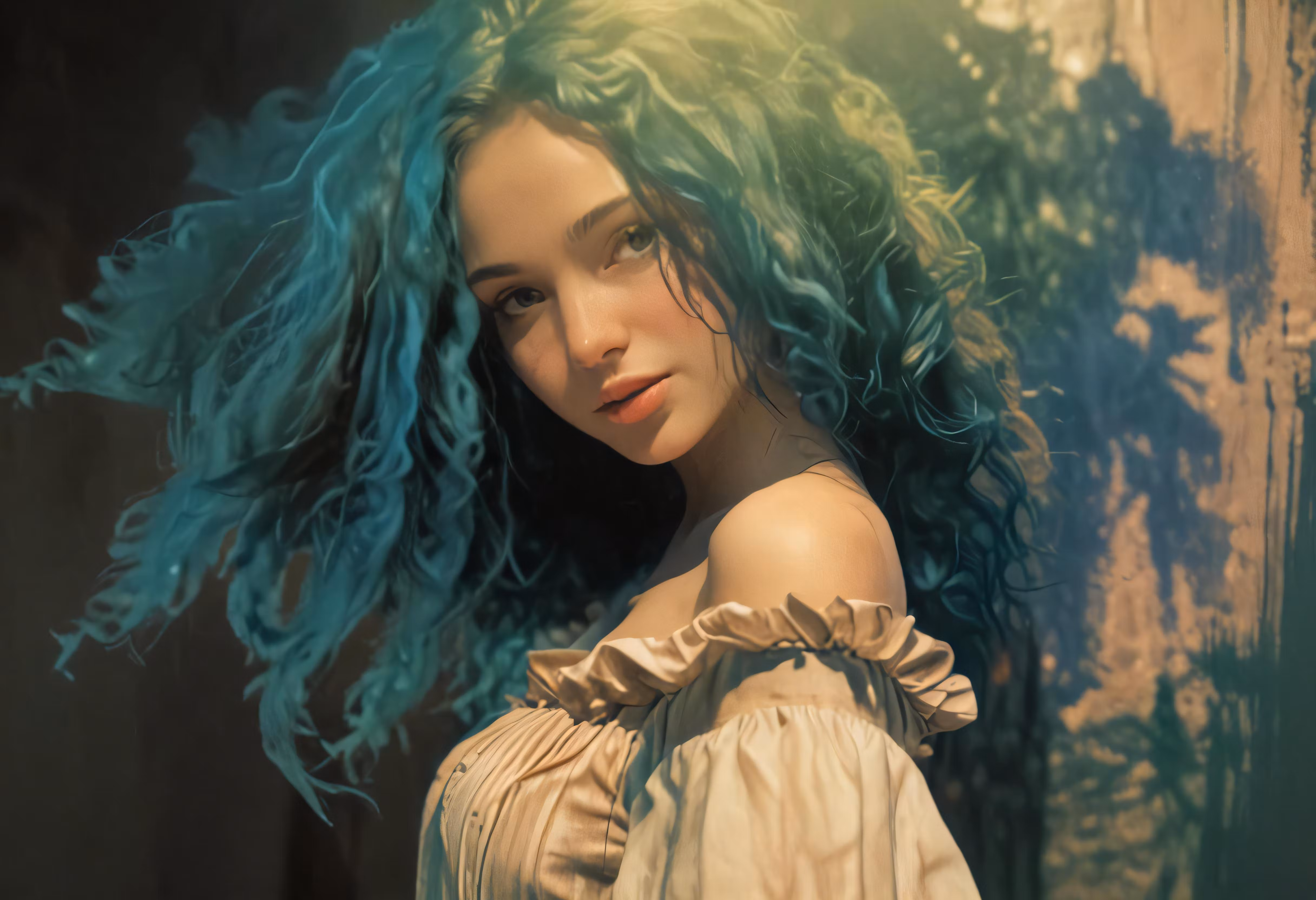 High resolution picture, free to use, a woman with blue hair posing in front of a tree