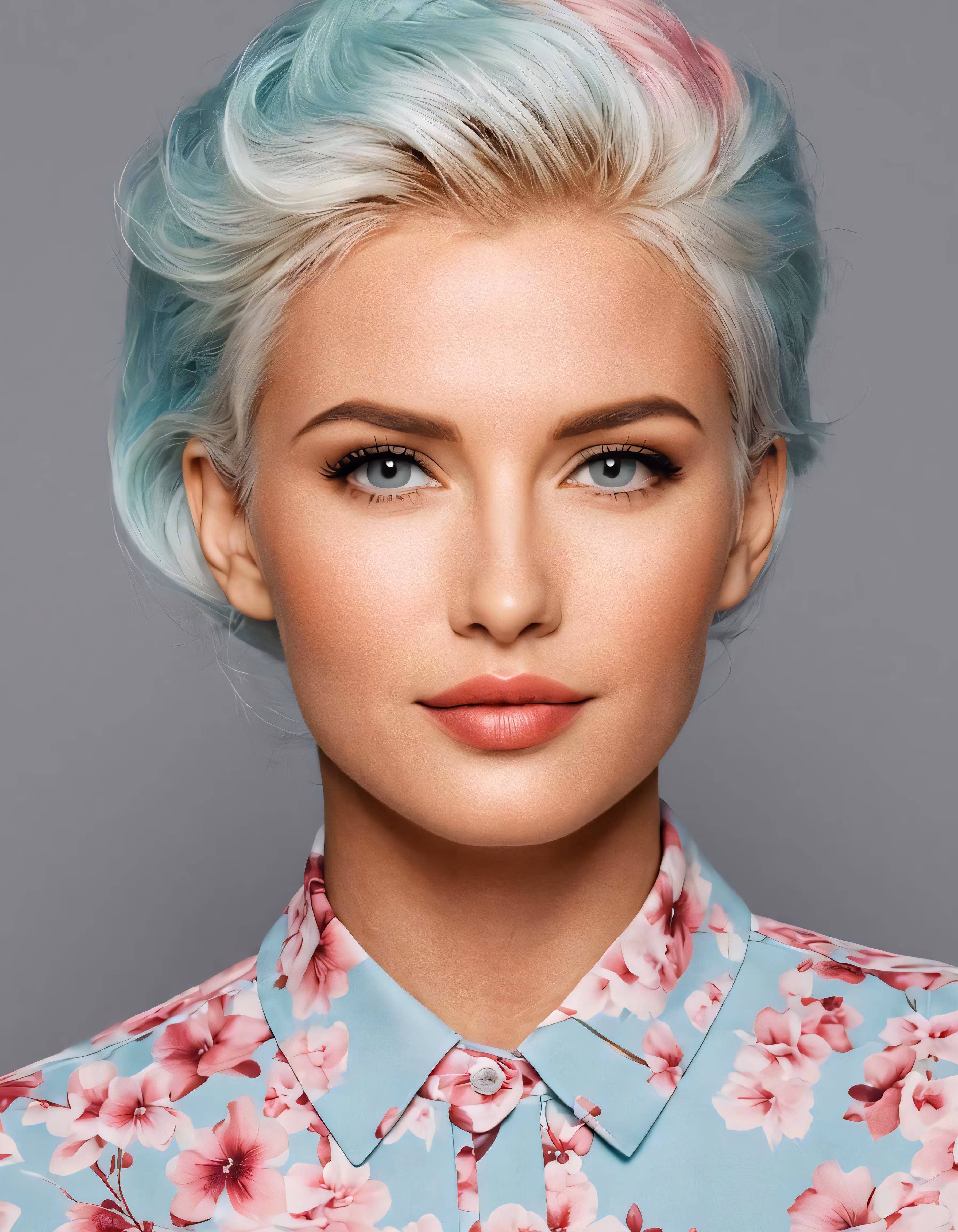 High resolution picture, free to use, a woman with blue hair wearing a blue shirt and pink flowers