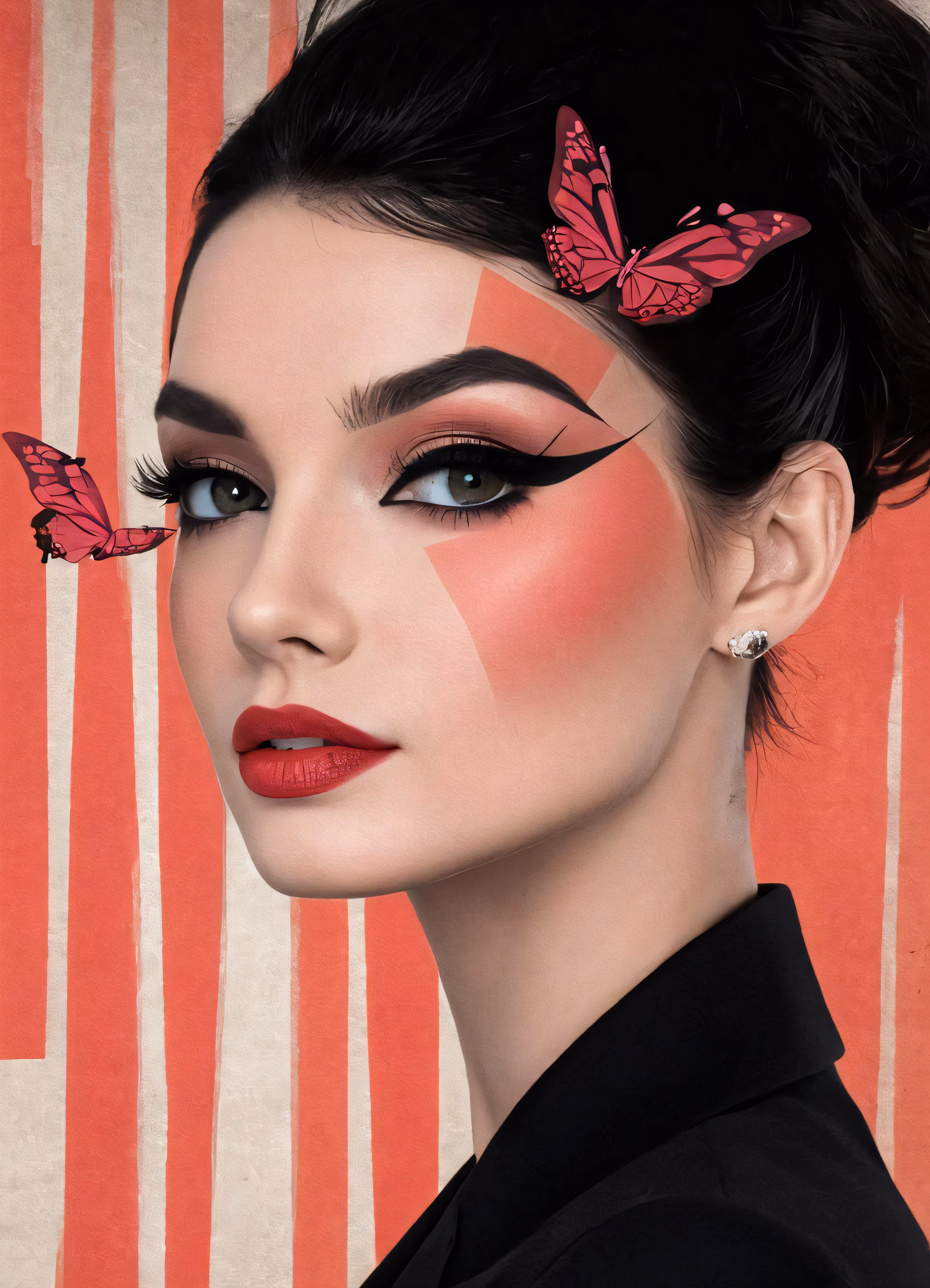 High resolution picture, free to use, a woman with bright red butterflies on her face