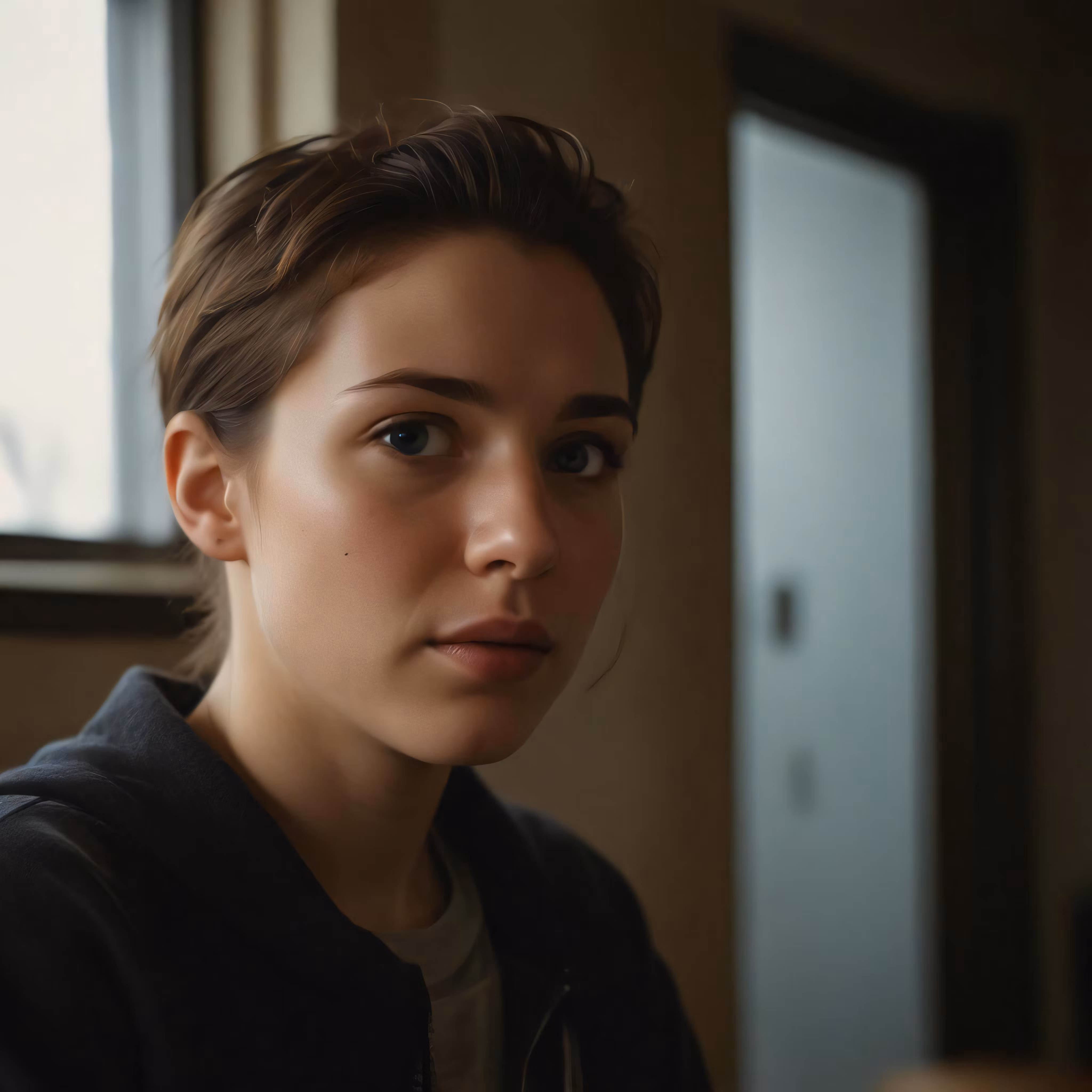 High resolution picture, free to use, a woman with brown hair and a black jacket