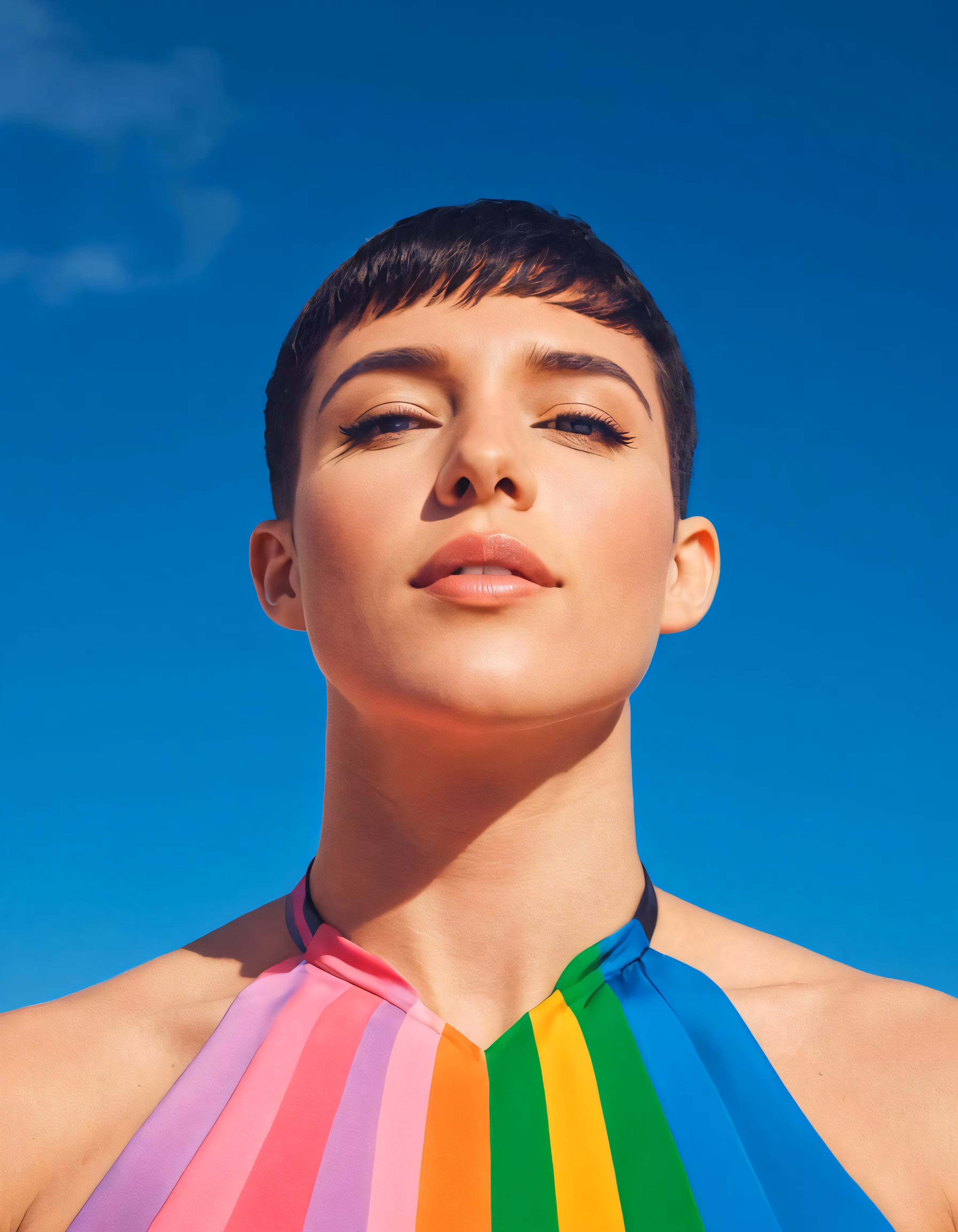High resolution picture, free to use, a woman with colorful makeup stands in front of the sky