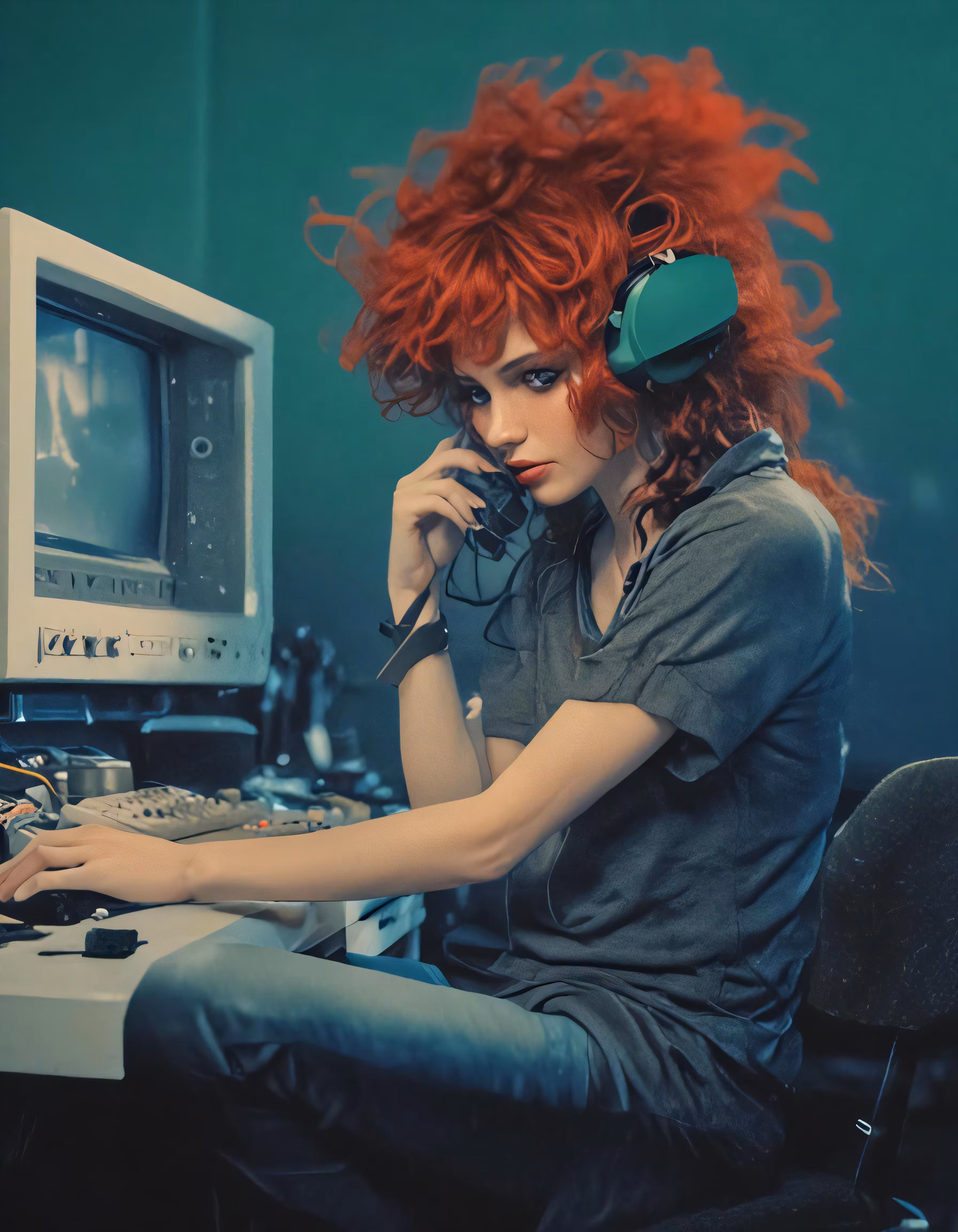 High resolution picture, free to use, a woman with curly hair sitting in front of a computer and holding a headphone to her ear