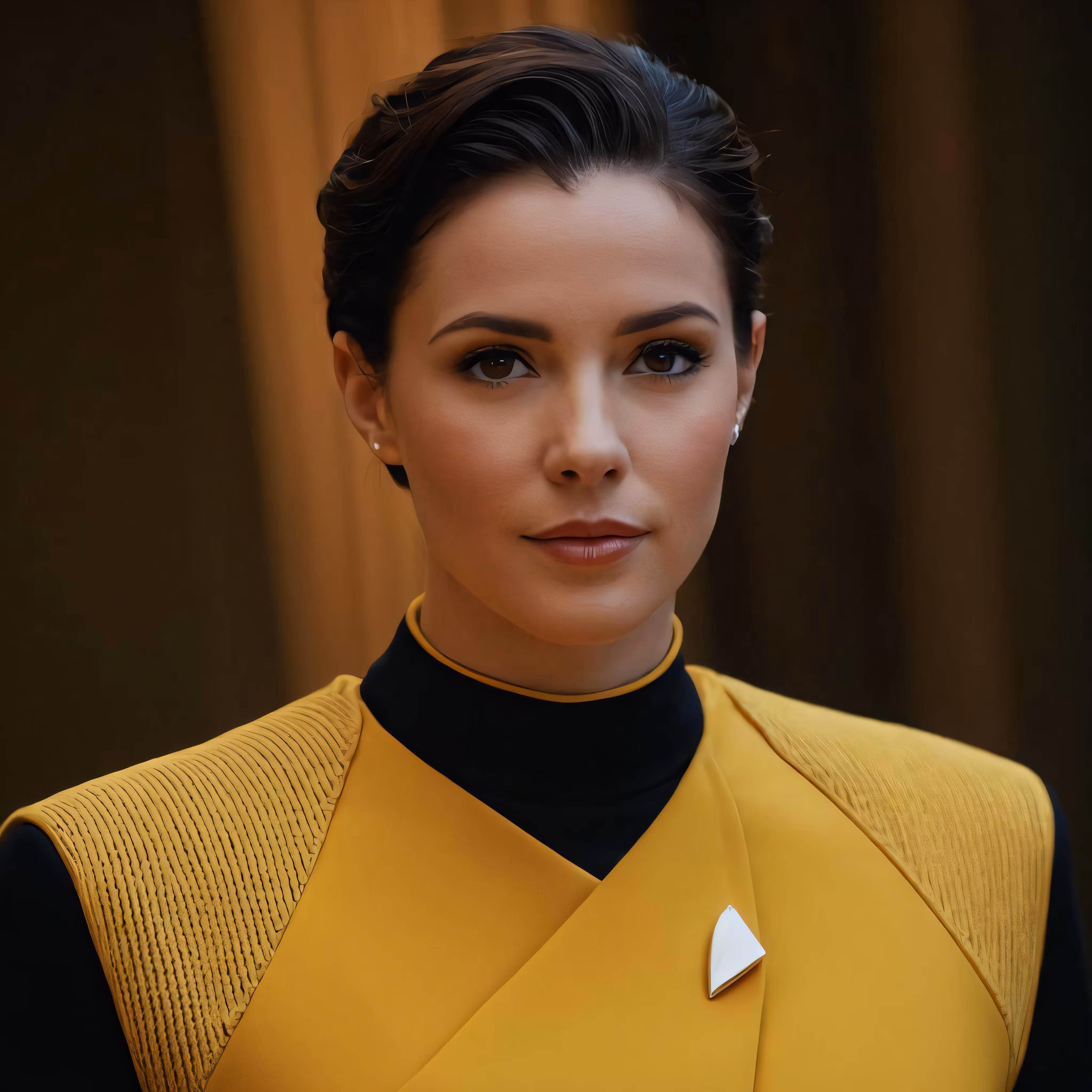 High resolution picture, free to use, a woman with dark hair wearing a yellow dress and a necklace