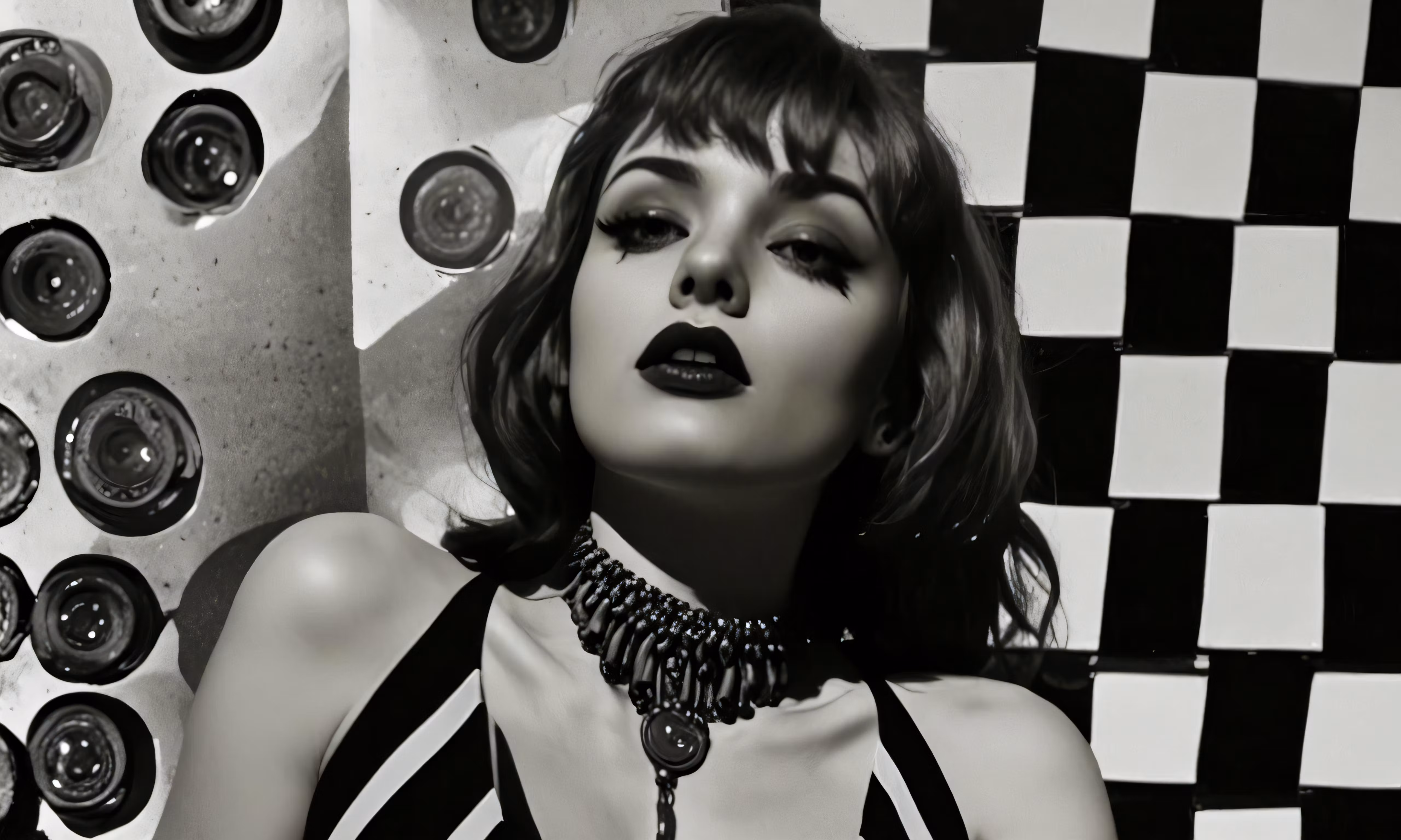 High resolution picture, free to use, a woman with dark lipstick posing against a checkerboard background