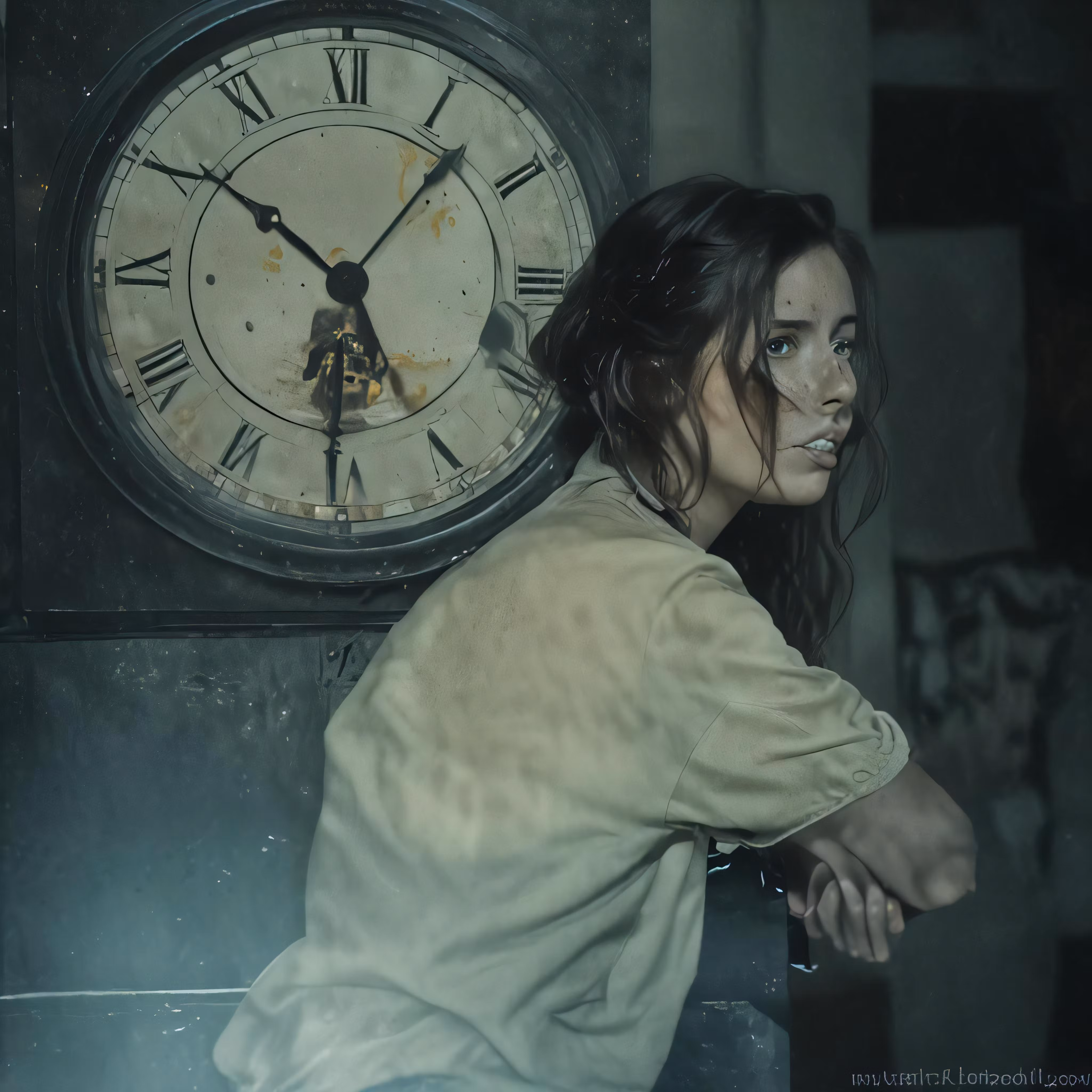 High resolution picture, free to use, a woman with face paint leaning on a clock