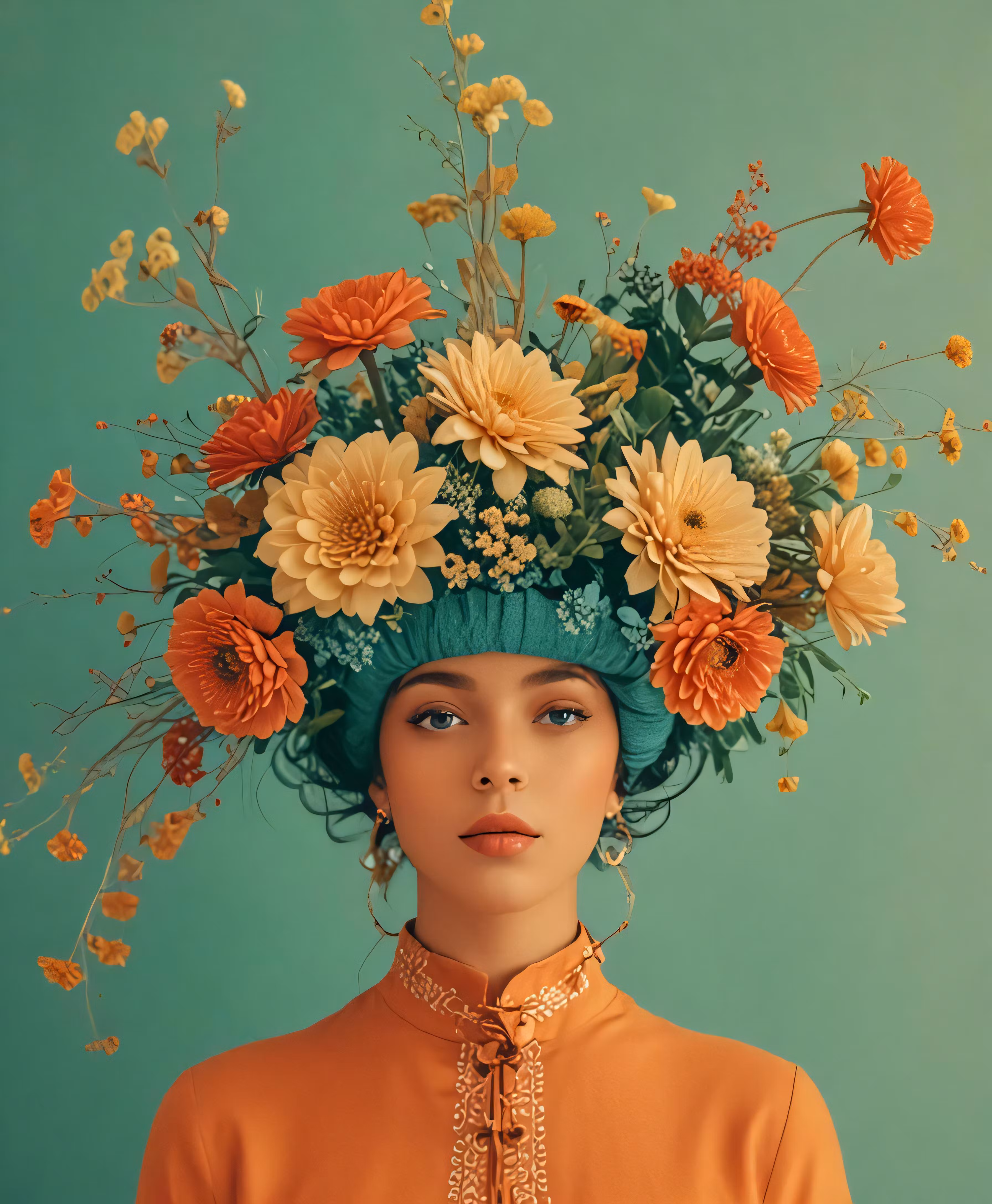 High resolution picture, free to use, a woman with flowers on her head and necklaces