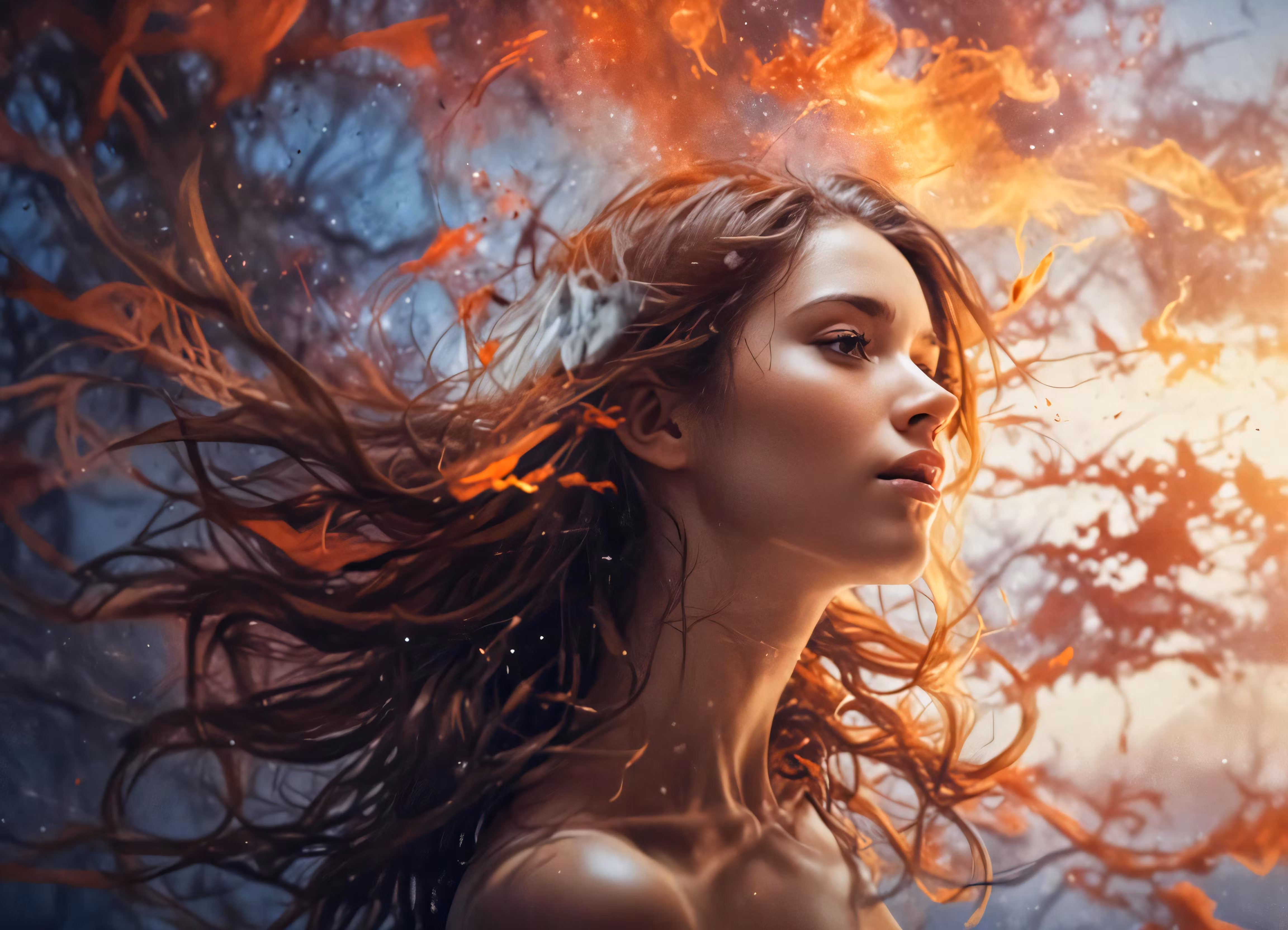 High resolution picture, free to use, a woman with flowing hair standing in front of an orange forest
