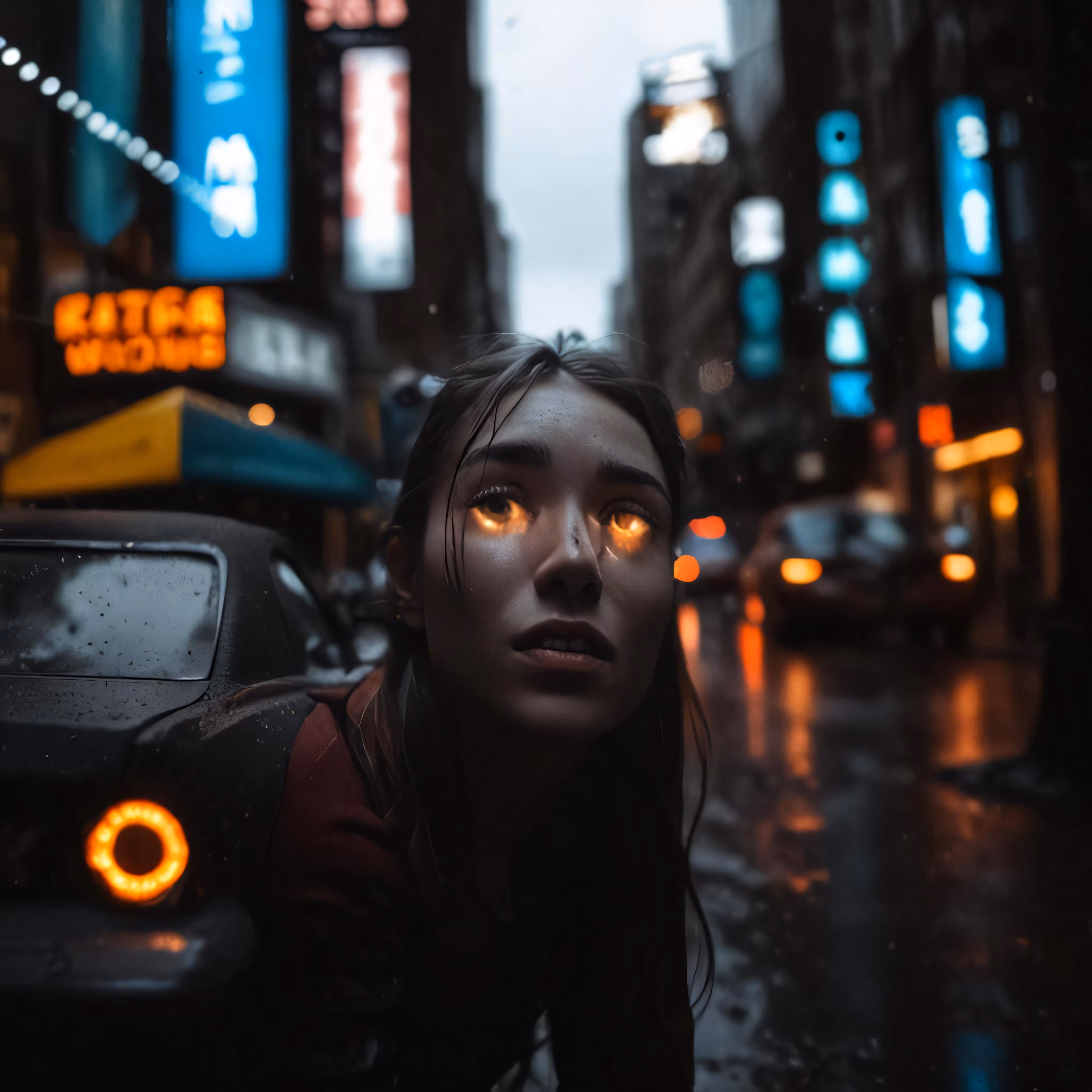 High resolution picture, free to use, a woman with glowing yellow eyes on a wet city street