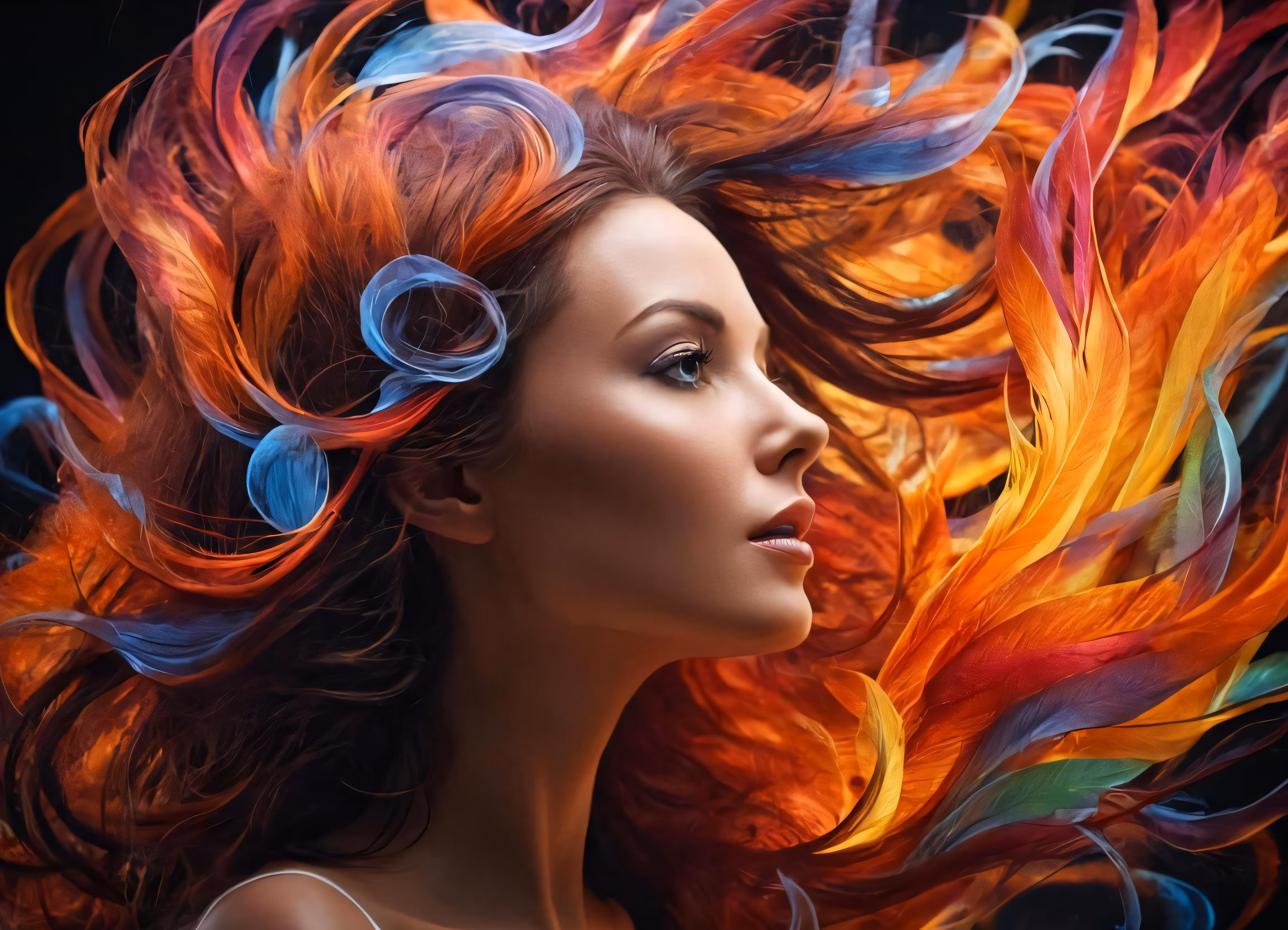 High resolution picture, free to use, a woman with hair covered in multicolored waves