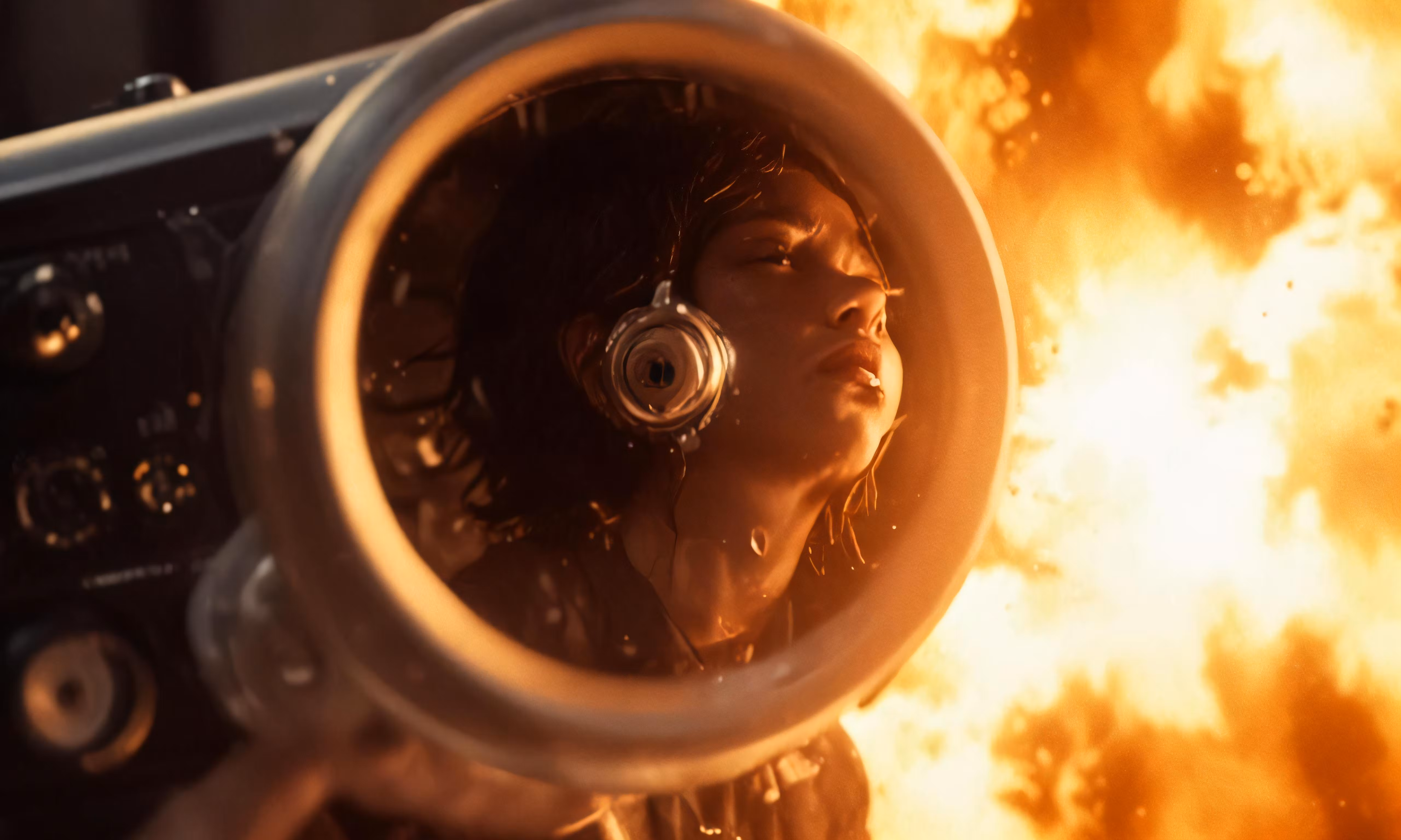 High resolution picture, free to use, a woman with headphones is shown through a flame