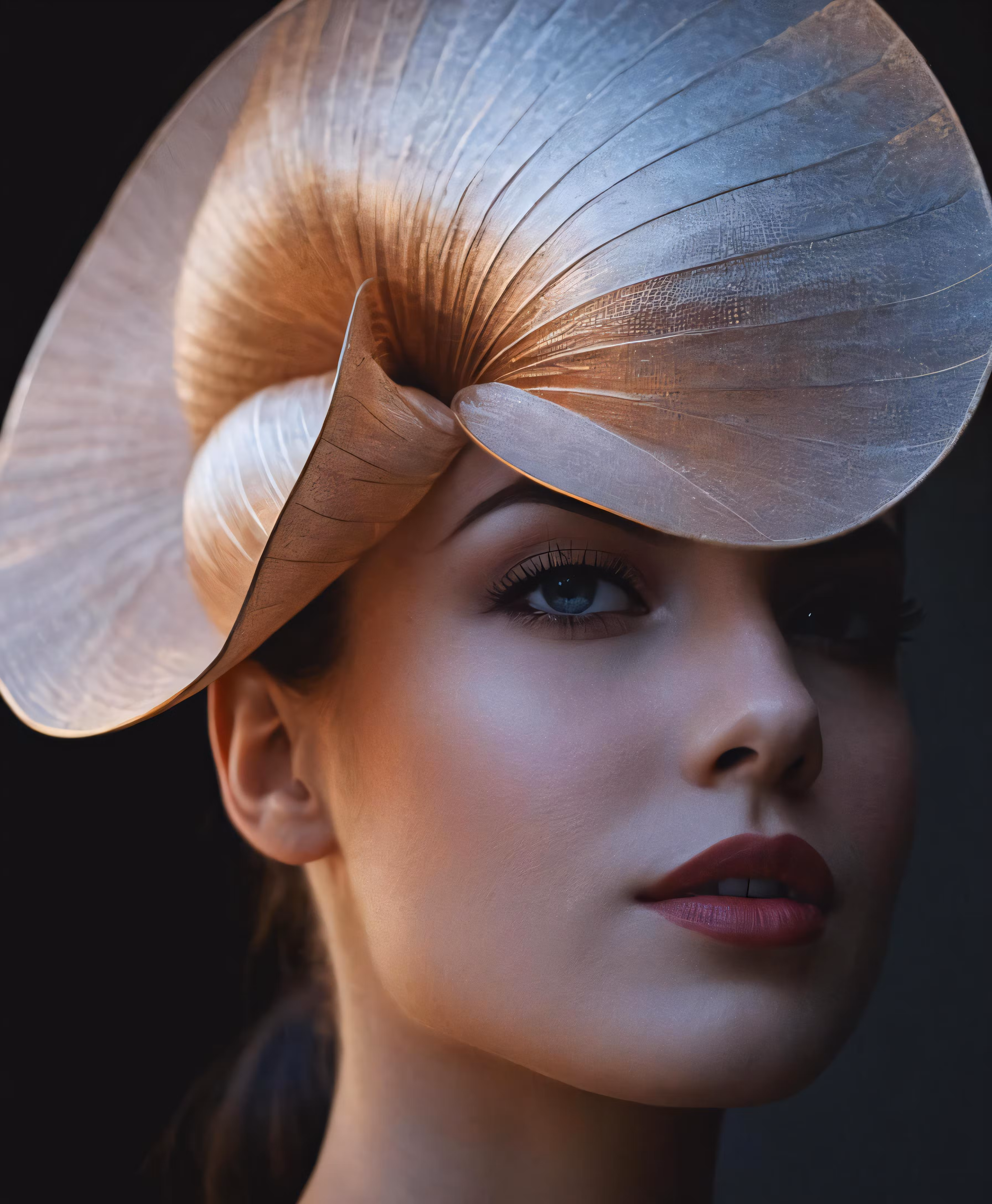 High resolution picture, free to use, a woman with her hair covered in a metal hat