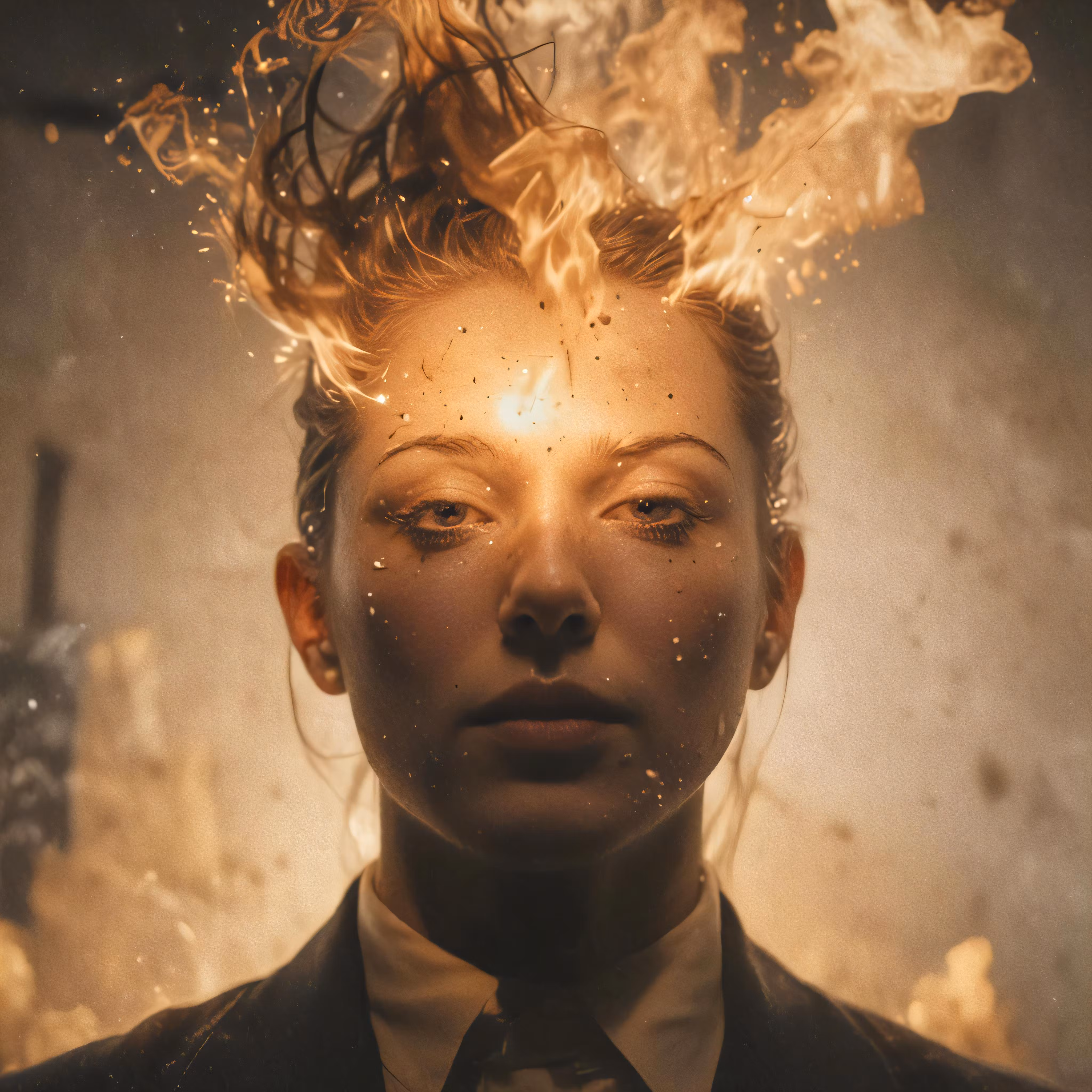 High resolution picture, free to use, a woman with her hair in the air is shown behind fire