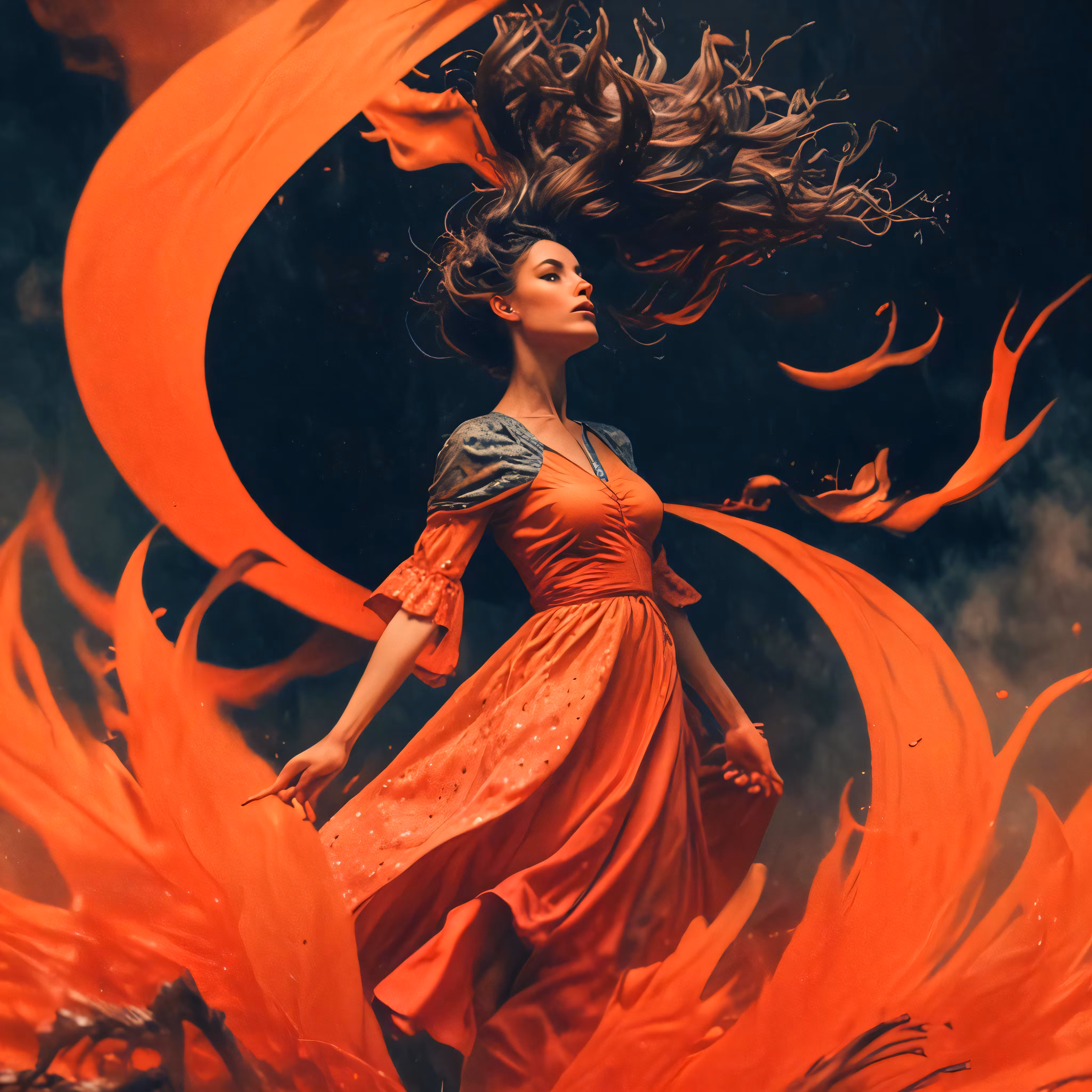 High resolution picture, free to use, a woman with her hair in the wind, wearing a flowing red dress