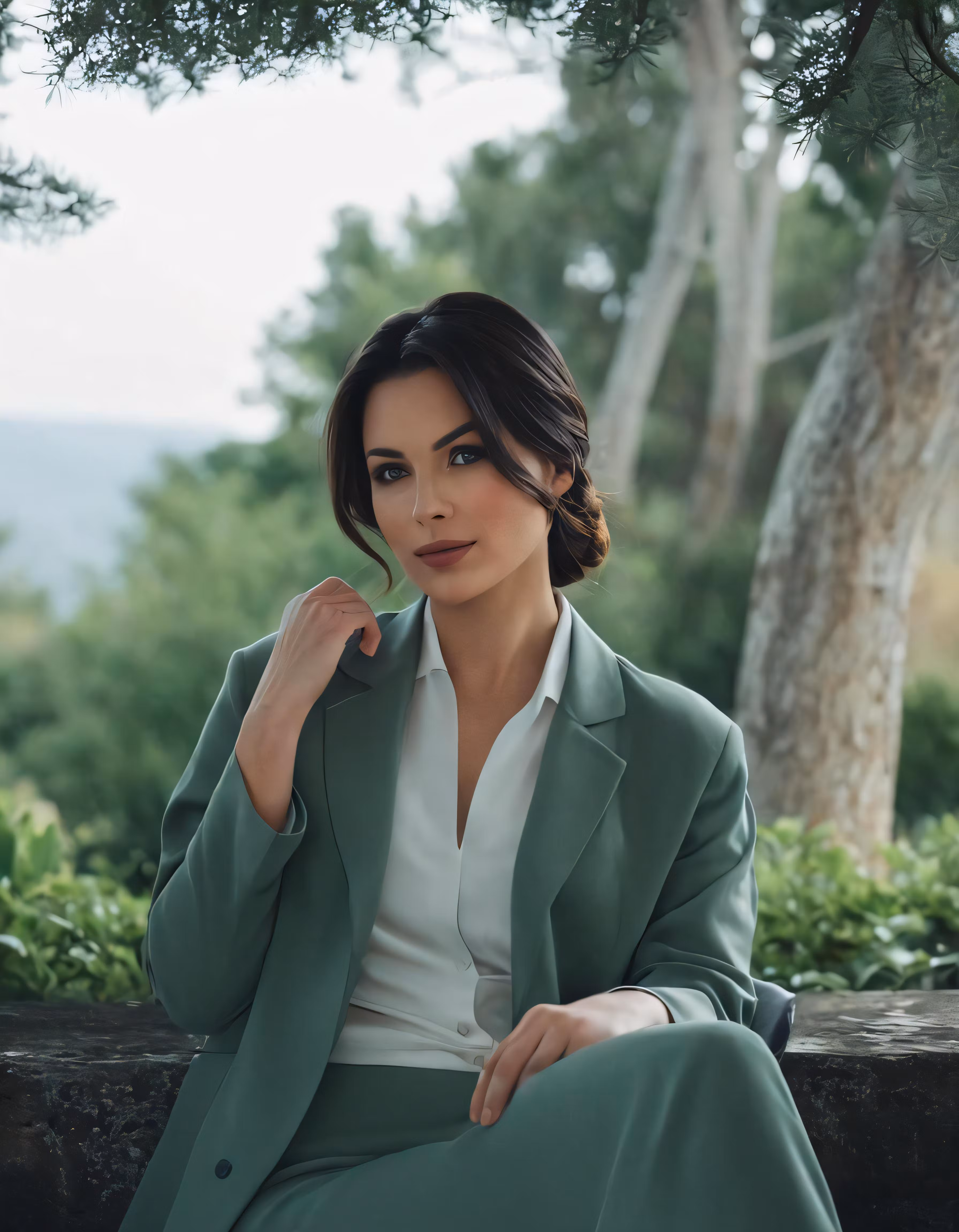 High resolution picture, free to use, a woman with her hair up in a ponytail, sits on a bench outdoors