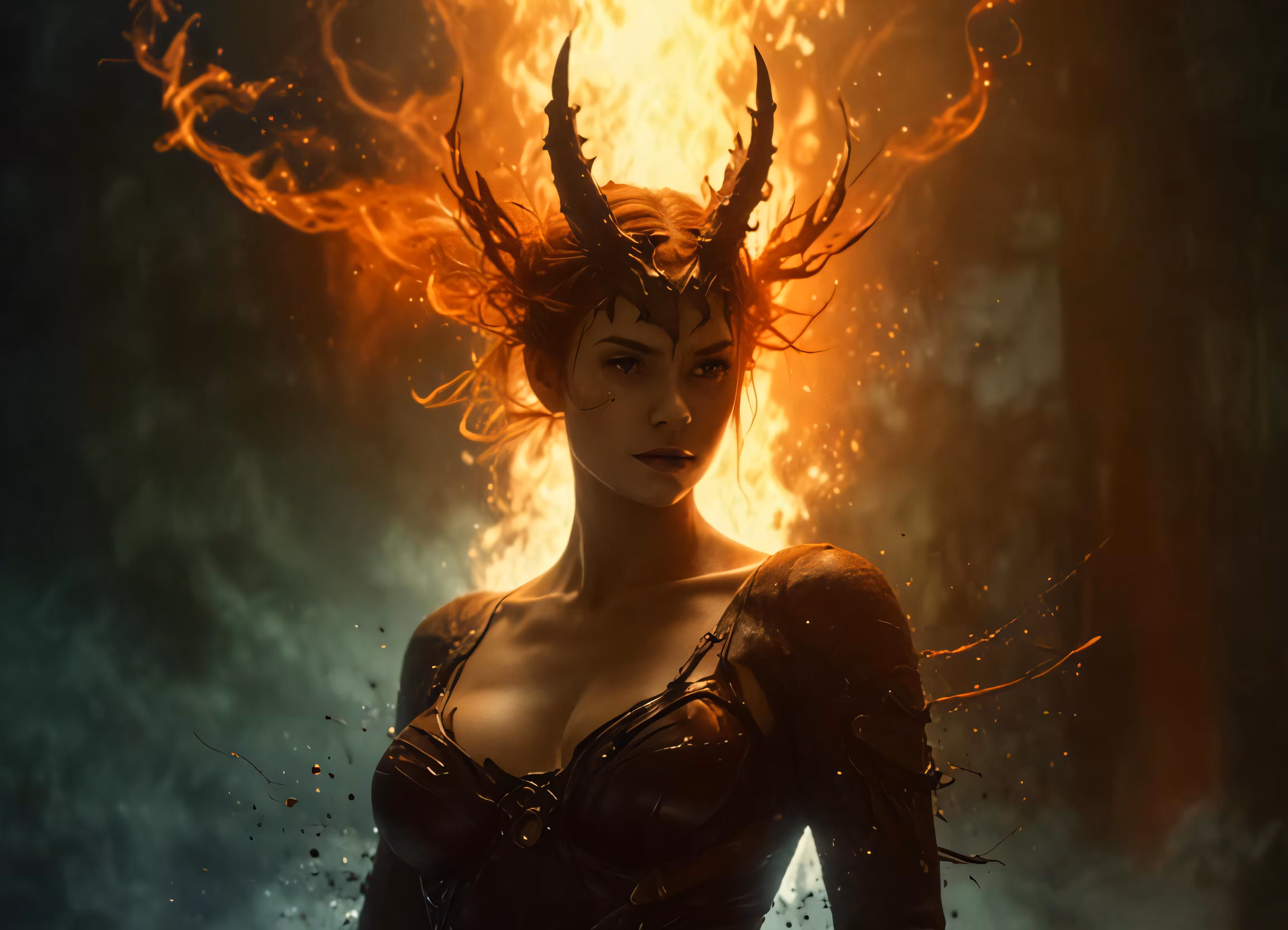 High resolution picture, free to use, a woman with horns standing next to a fire in the woods
