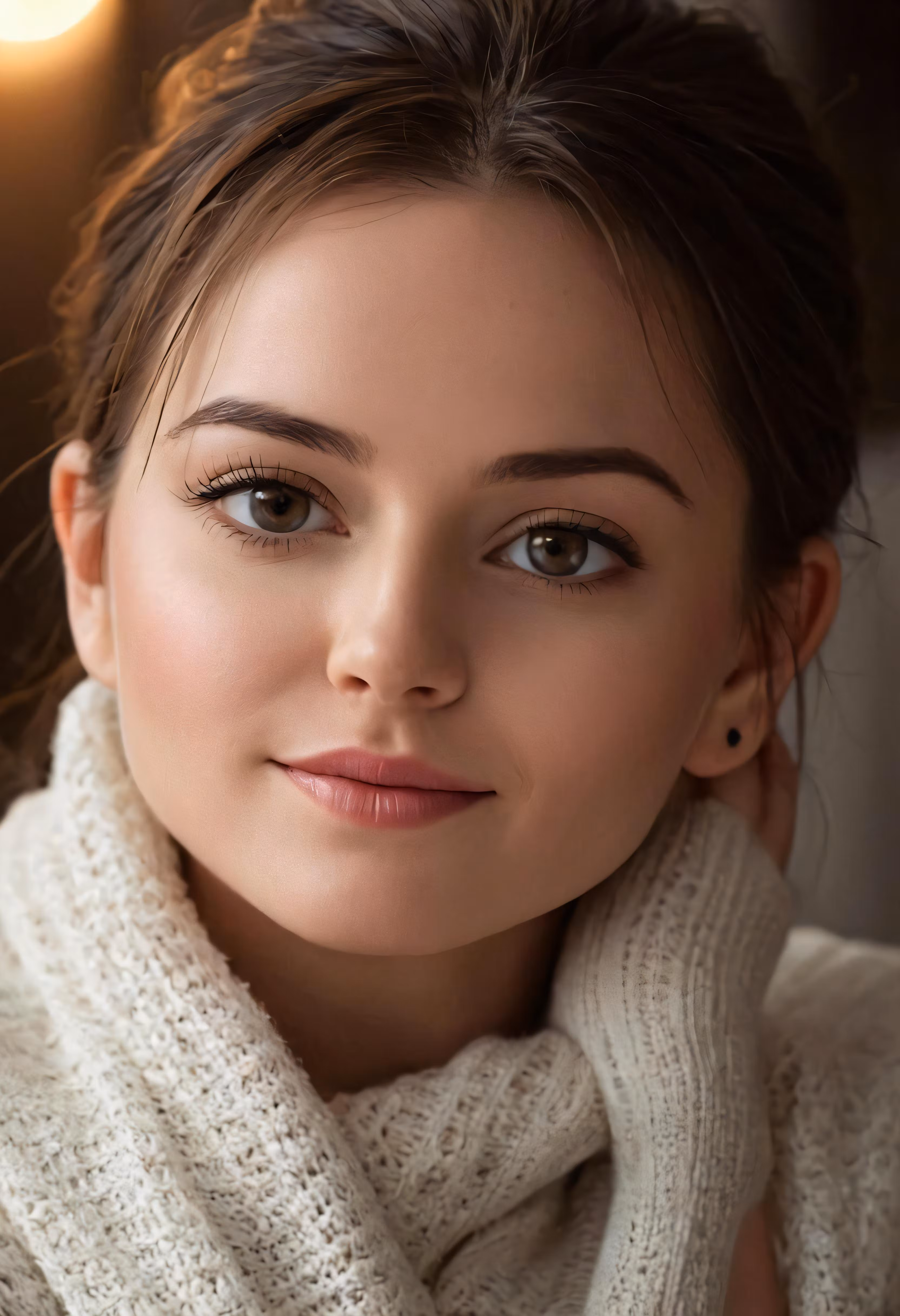 High resolution picture, free to use, a woman with light brown eyes, wearing a white sweater and a light colored turtleneck