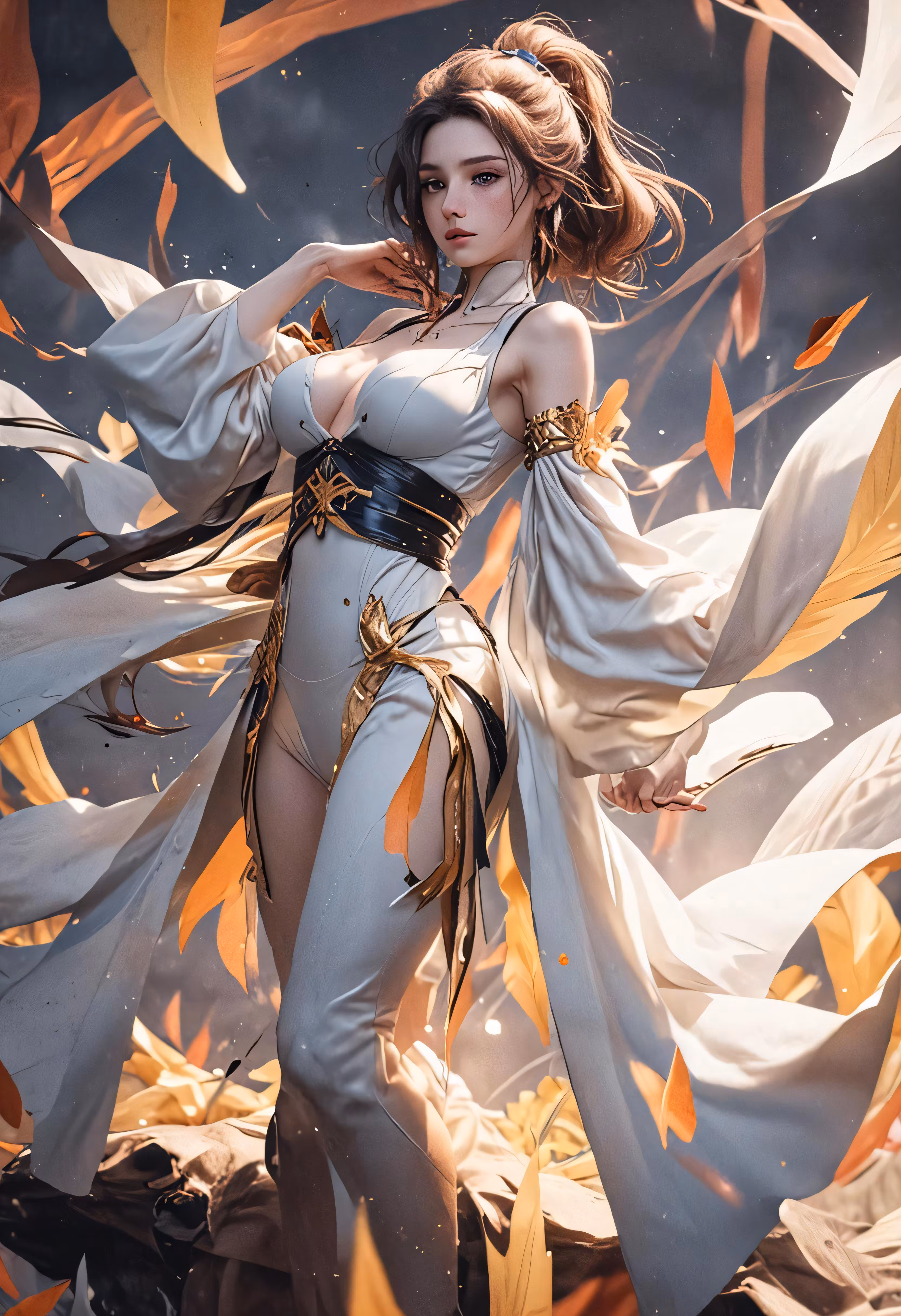 High resolution picture, free to use, a woman with long, thin white dresses and gold trim