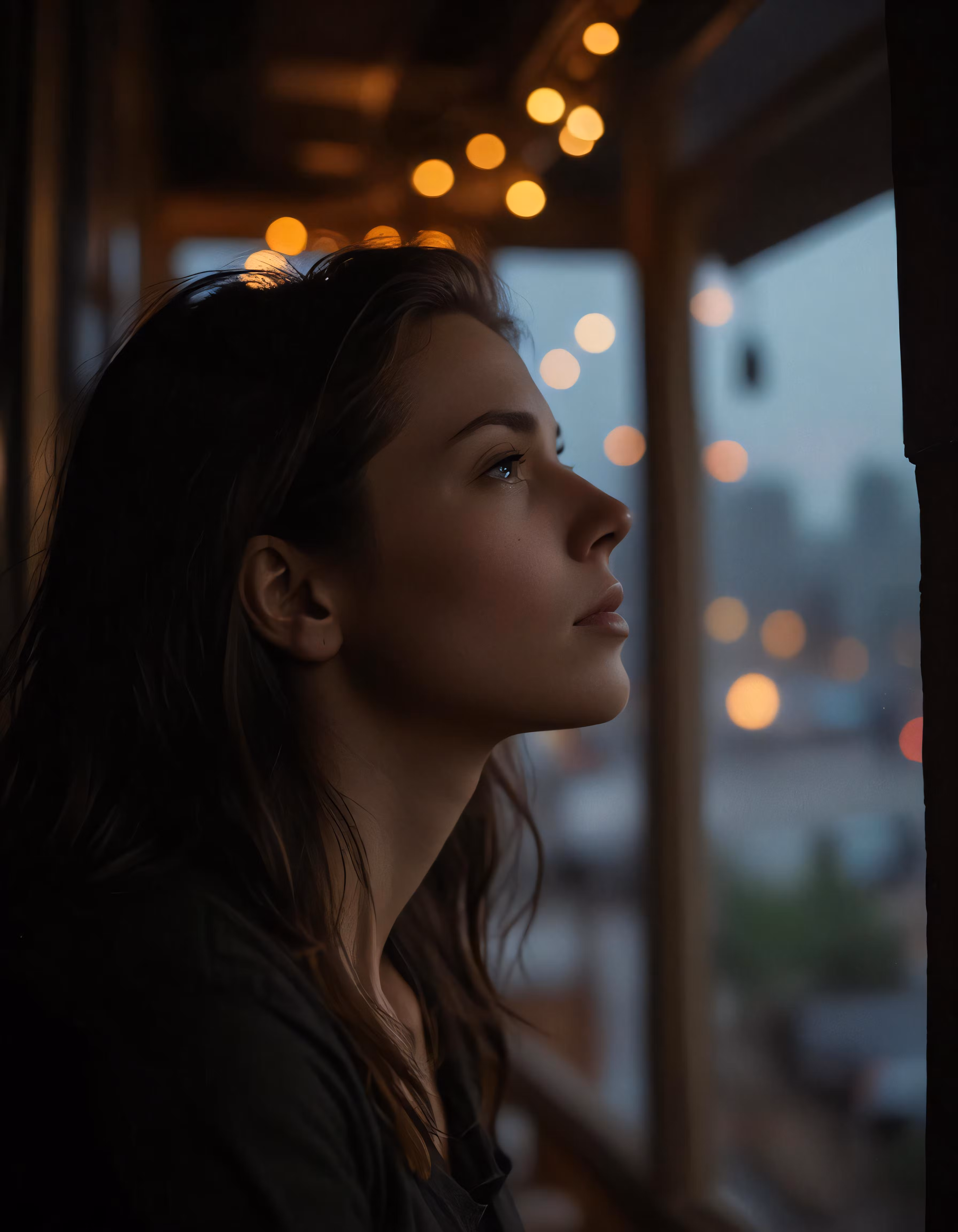 High resolution picture, free to use, a woman with long brown hair looking at lights