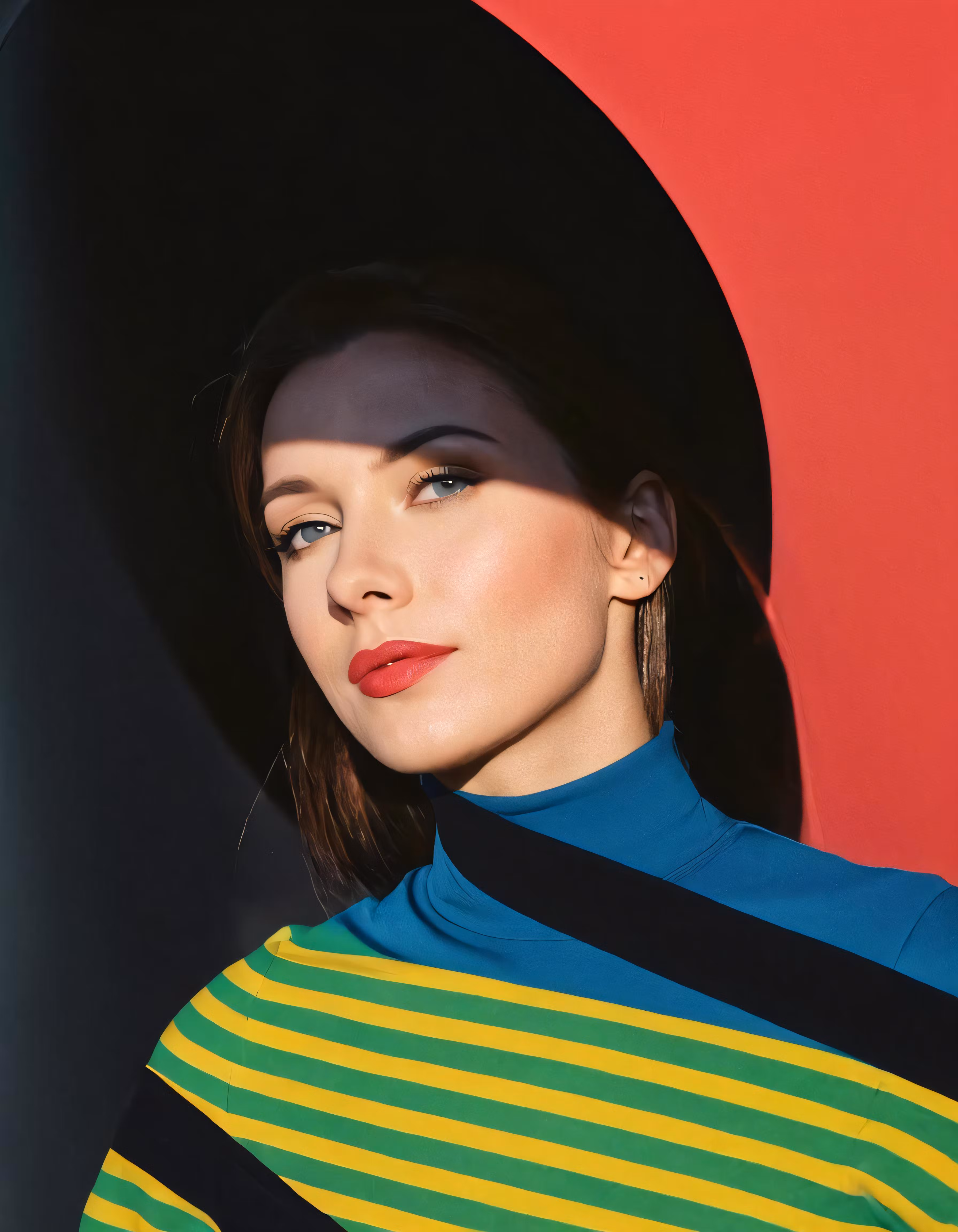 High resolution picture, free to use, a woman with long brown hair wearing a black hat and a blue shirt