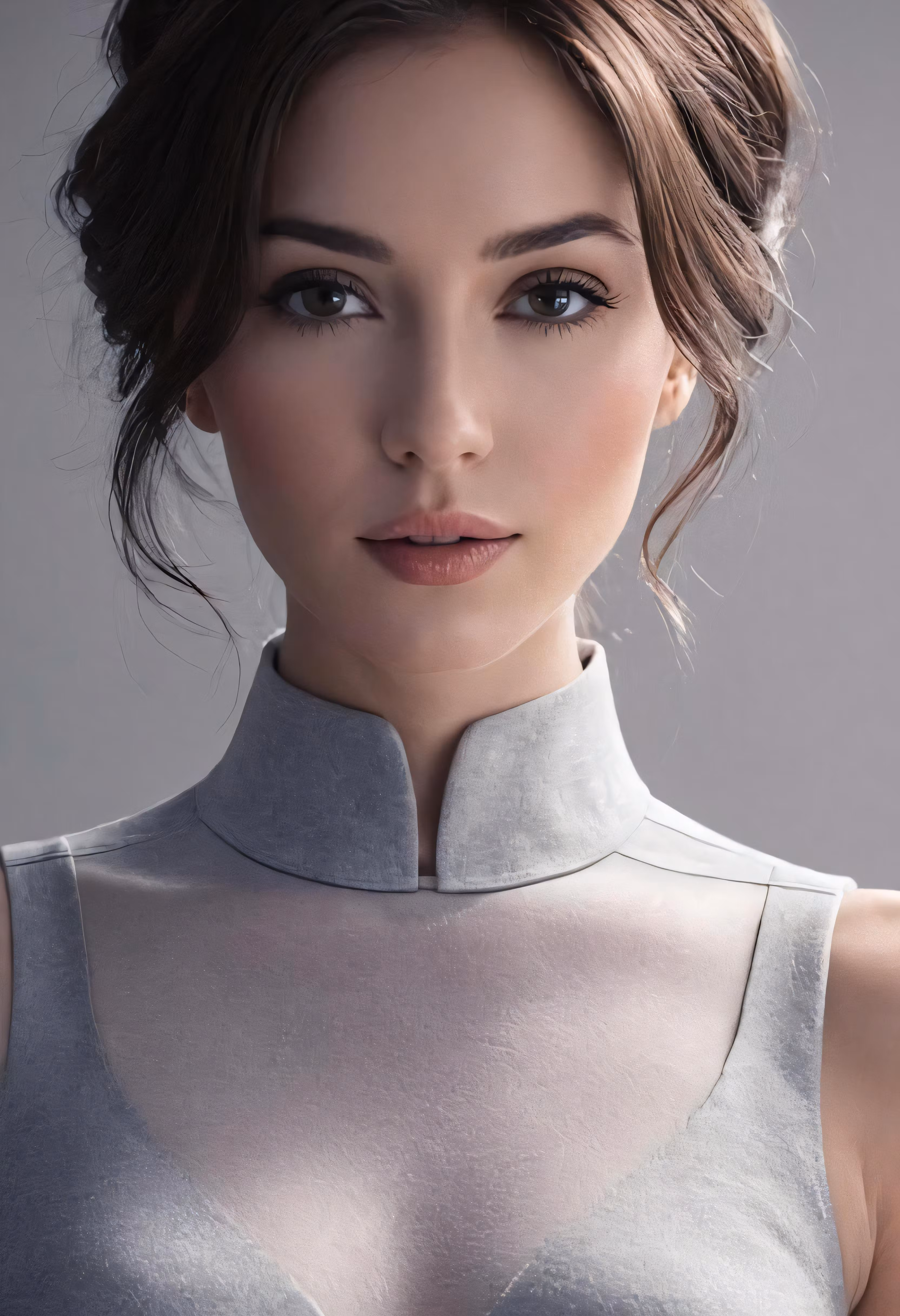 High resolution picture, free to use, a woman with long brown hair wearing a silver top